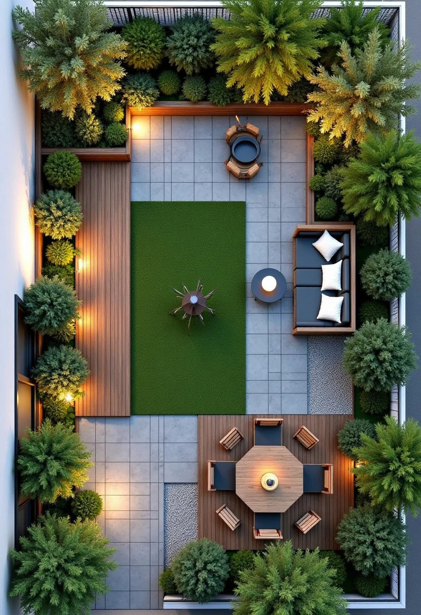 Top view of garden designs, rooftop - style, with compact planters, a mini - lawn, foldable furniture, and LED string lights.