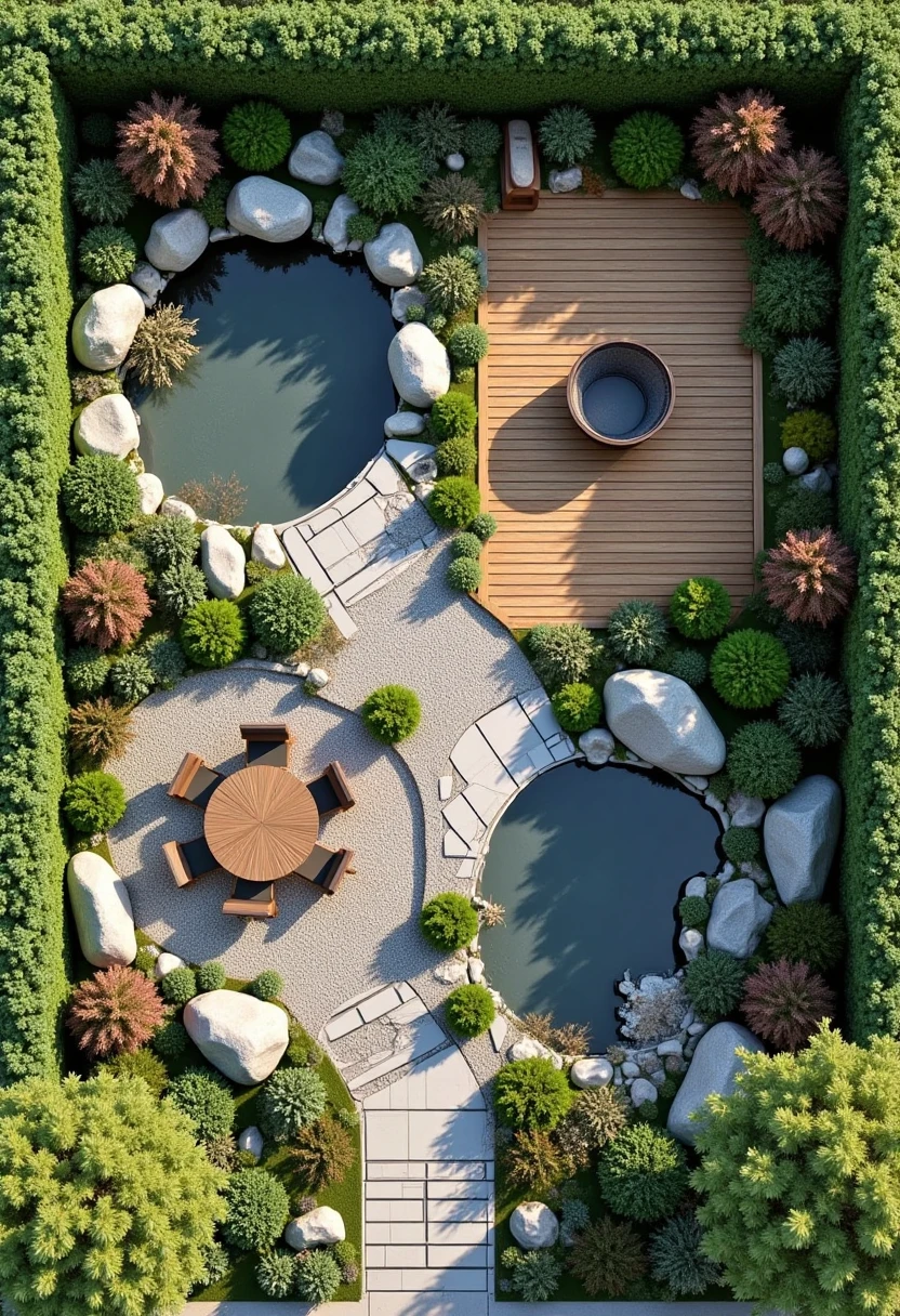 Top view of garden designs, Japanese - inspired, featuring raked gravel, bonsai trees, wooden pavilions, and stone lanterns for tranquility.