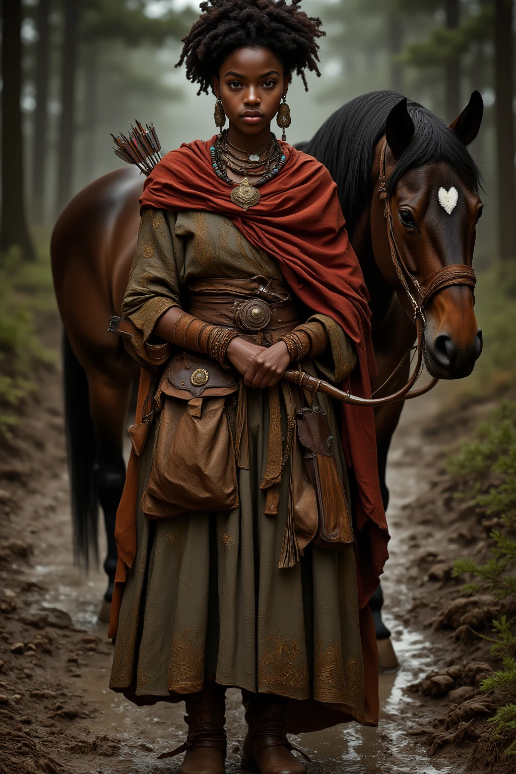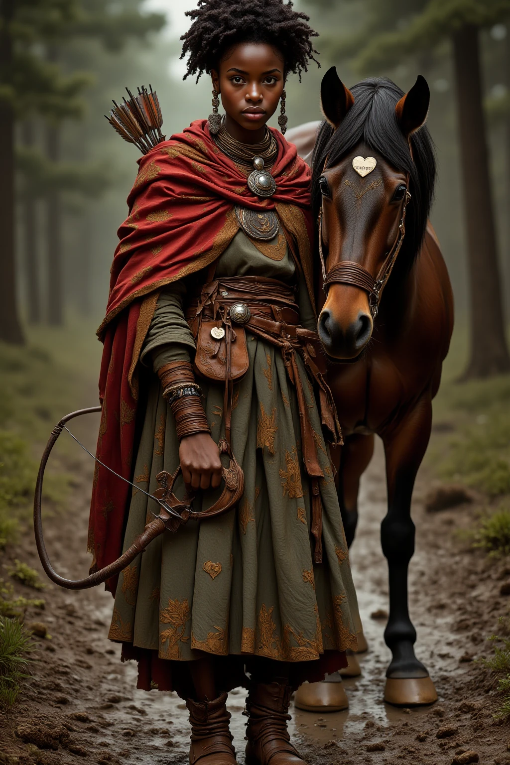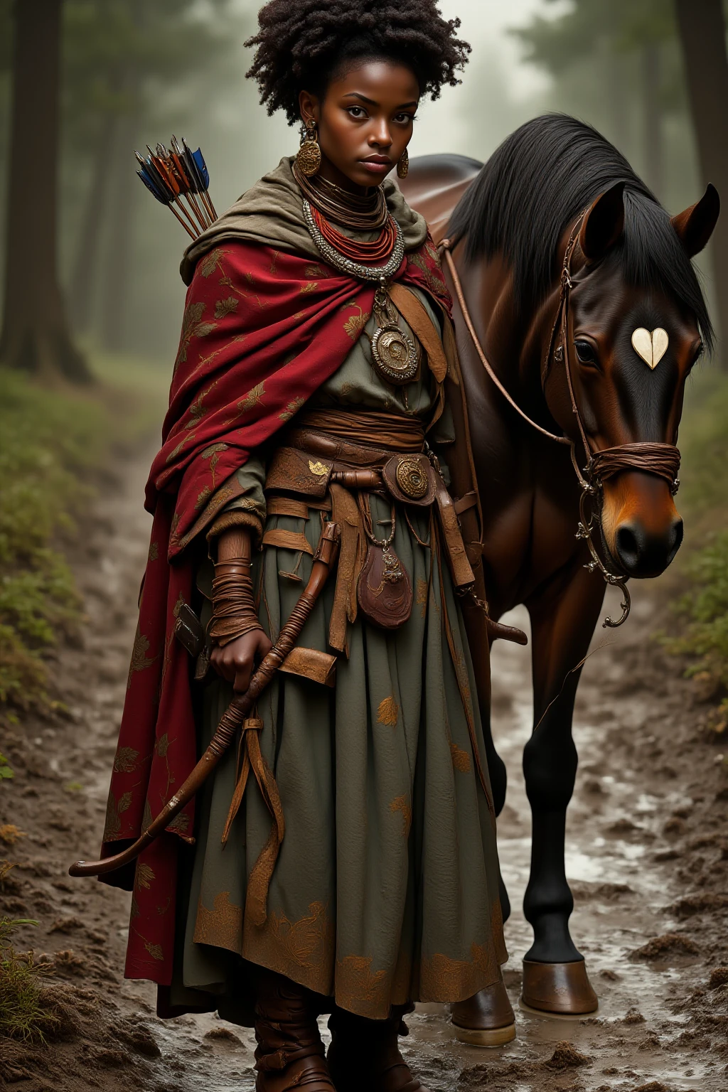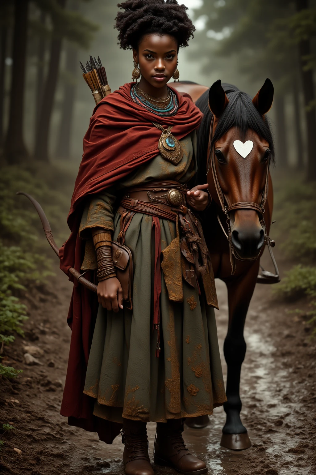 "A photo-realistic shoot from a front camera angle about a young woman dressed in traditional clothing stands confidently beside a horse in a forest setting, holding a bow and arrow. on the middle of the image, a 20-year-old dark-skinned woman with an afro hairstyle appears to be standing, looking directly at the viewer with a serious expression. she is wearing a long, flowing dress with intricate gold embroidery and a red shawl draped over her shoulders. her hair is styled in an intricate updo, and she is adorned with jewelry including earrings, a necklace, and a sword. on her right side, a brown horse with a black mane and a white heart-shaped mark is standing beside her. the background is blurred, with trees and greenery, and the lighting is soft and natural, creating a serene atmosphere.