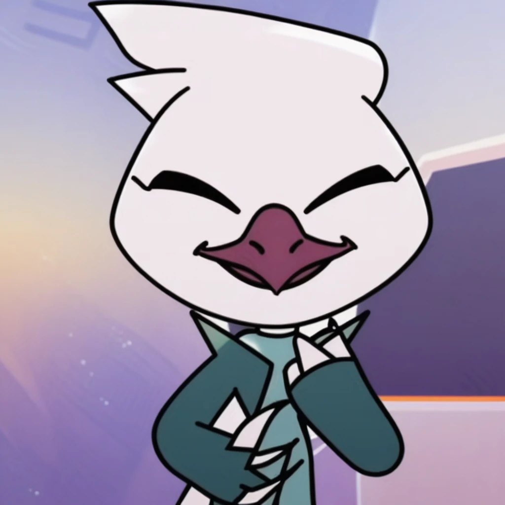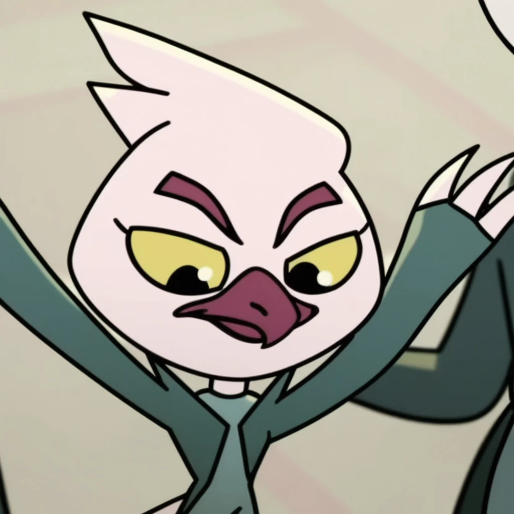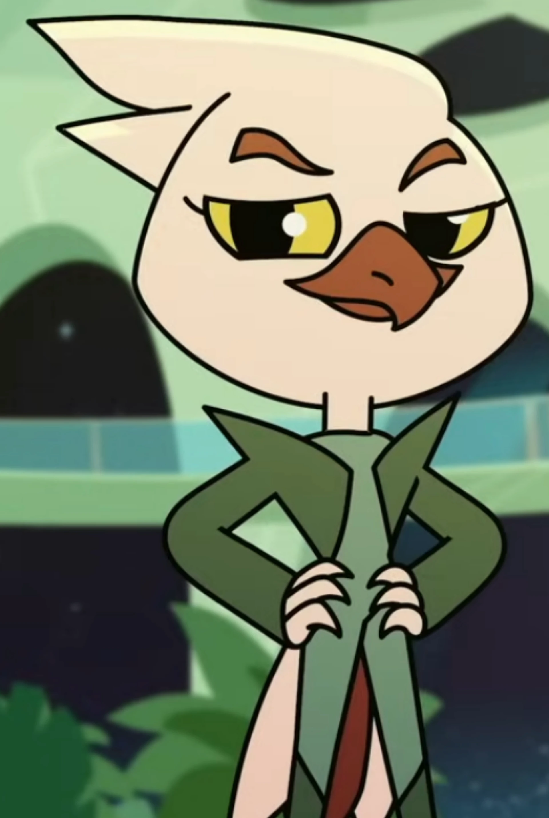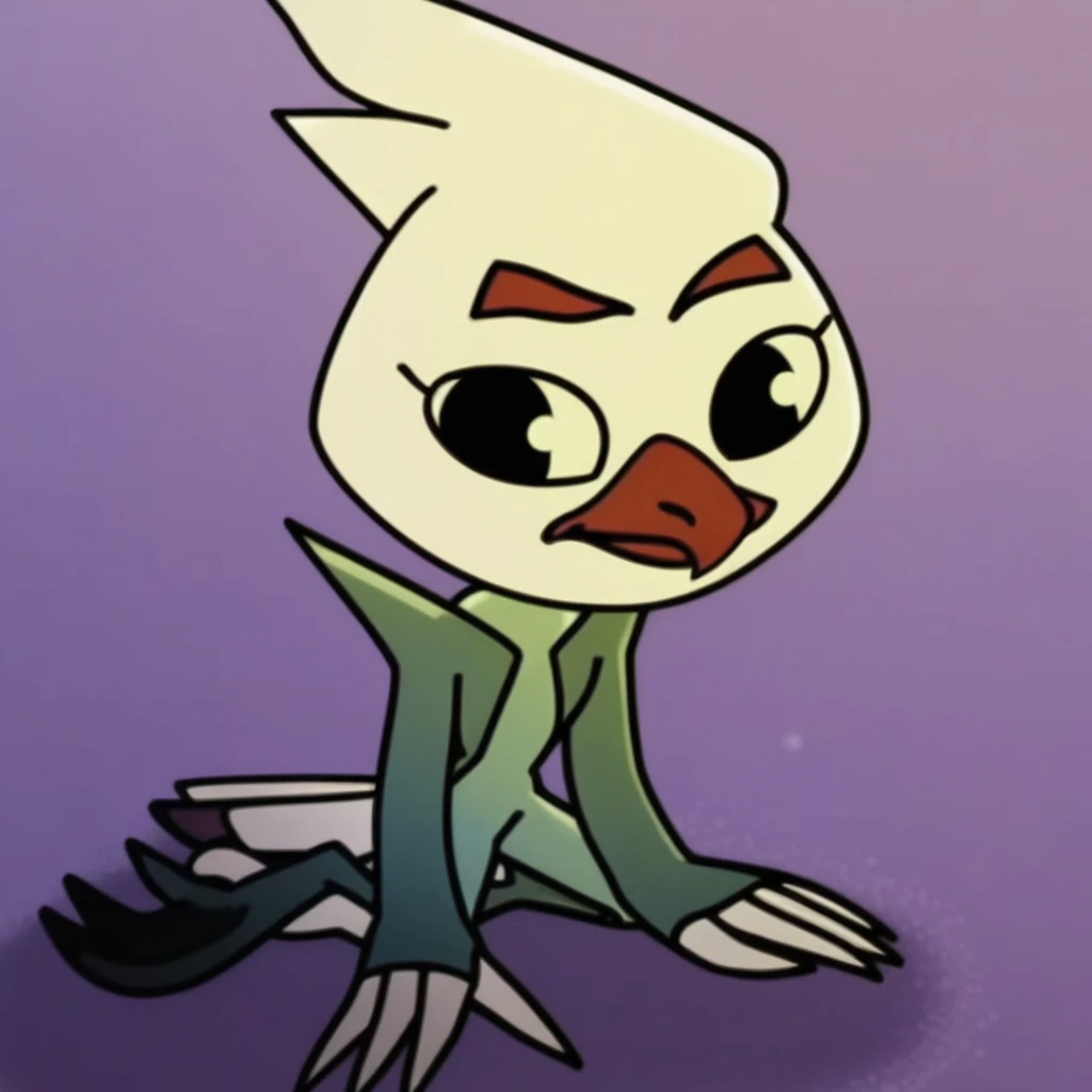 white body, white haircut, black eyes, yellow sclera, purple eyebrows, bird nose, beak, purple beak, no ears, bitd tail, long tail, bird legs, four fingers on arms