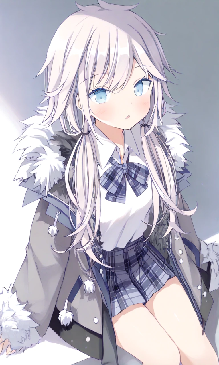 light gray hair, jacket, long hair, blue eyes, plaid, bow, shirt, collared shirt, pleated skirt, blue bow, fur trim, low twintails, open jacket, plaid skirt, long sleeves, white shirt, gray winter boots,fluffy wolf tail
