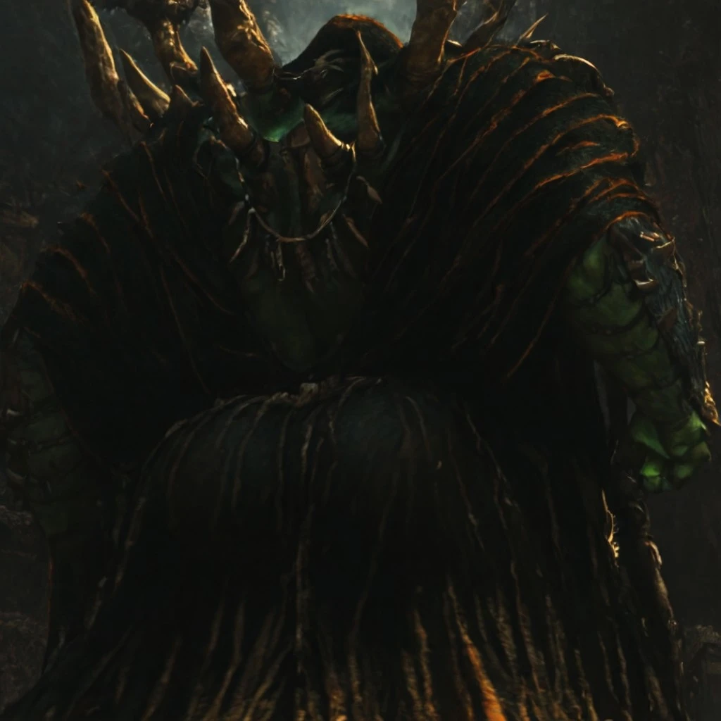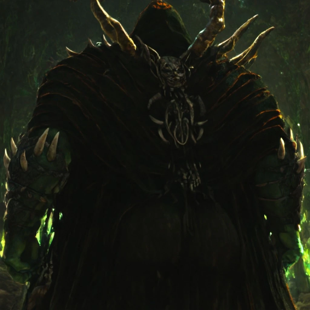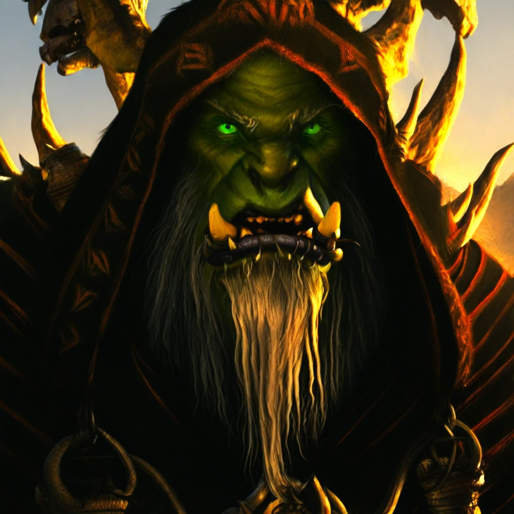 Gul'dan, old, male, orc, green eyes, beard, white hair, bald, tusks, fangs, wrinkles, green skin, tusk piercing, lip piercing, tattered robes of leather and cloth, bone spikes, hunched, bara, strong jawline, heavy brow ridge, Wide jaw, broad nose, rugged, giant,