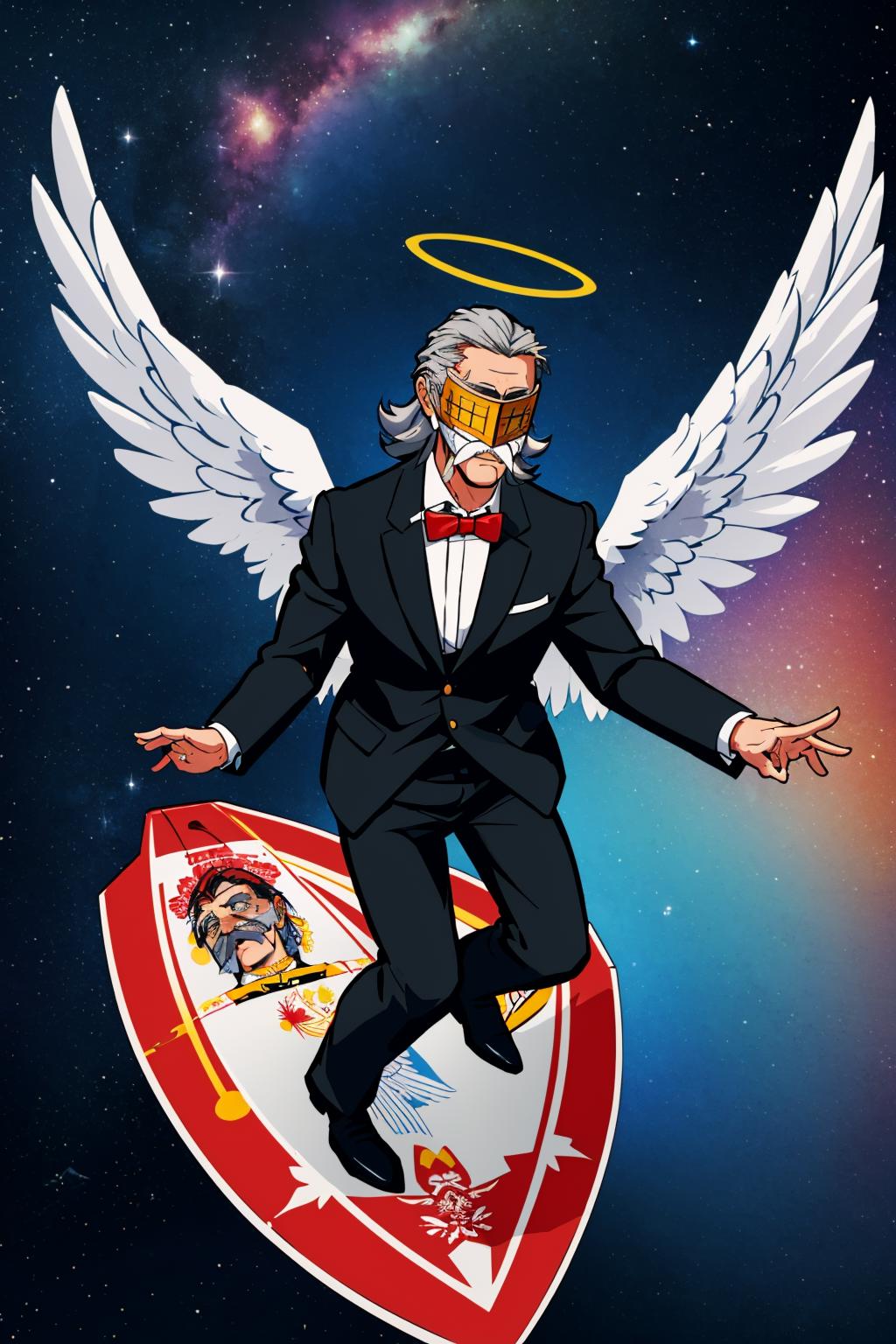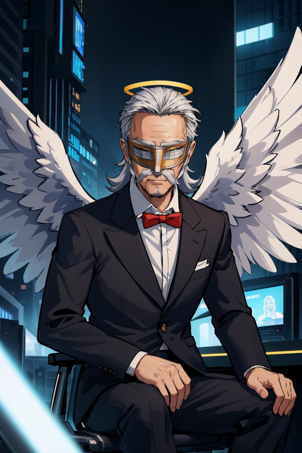 Tags: Persona - yamaokap1, yamaokamask, formal, facial hair, suit, mustache, grey hair, old man, old, beard, bowtie halo, mask, feathered wings, angel