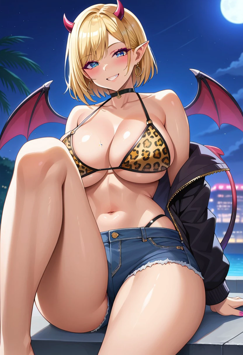 purple eyes, eyeshadow, blue eyes, blonde hair, short hair, demon horns, pointy ears, bare shoulders, fingernails, tattoo, wings, tail,