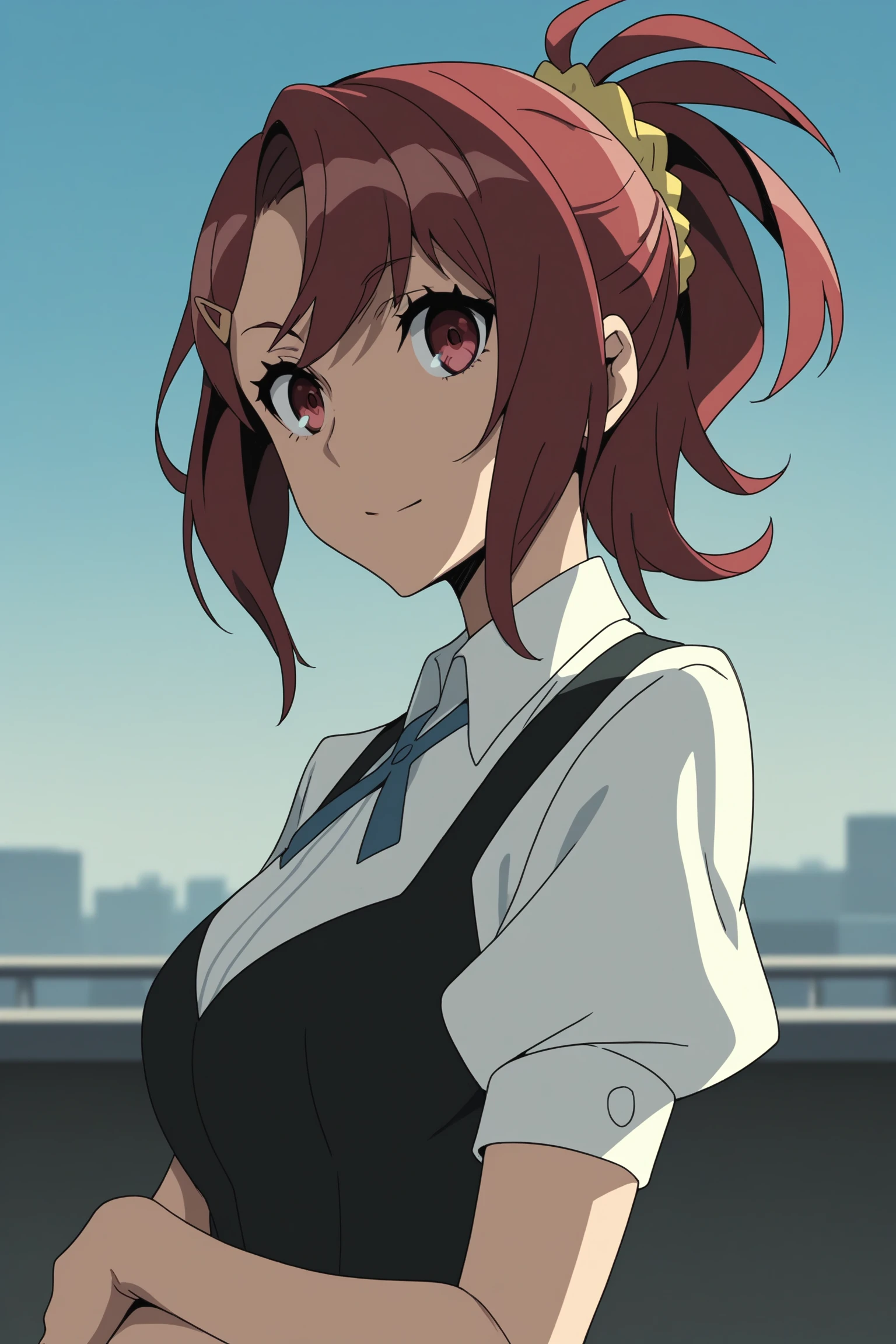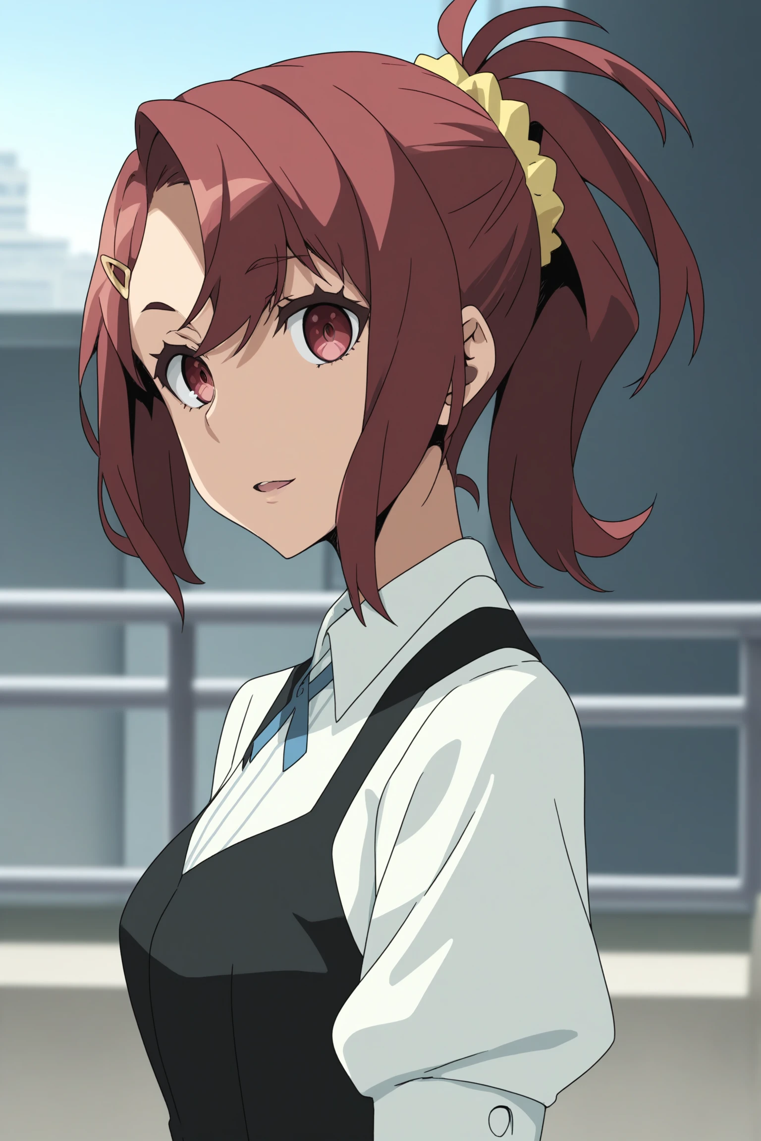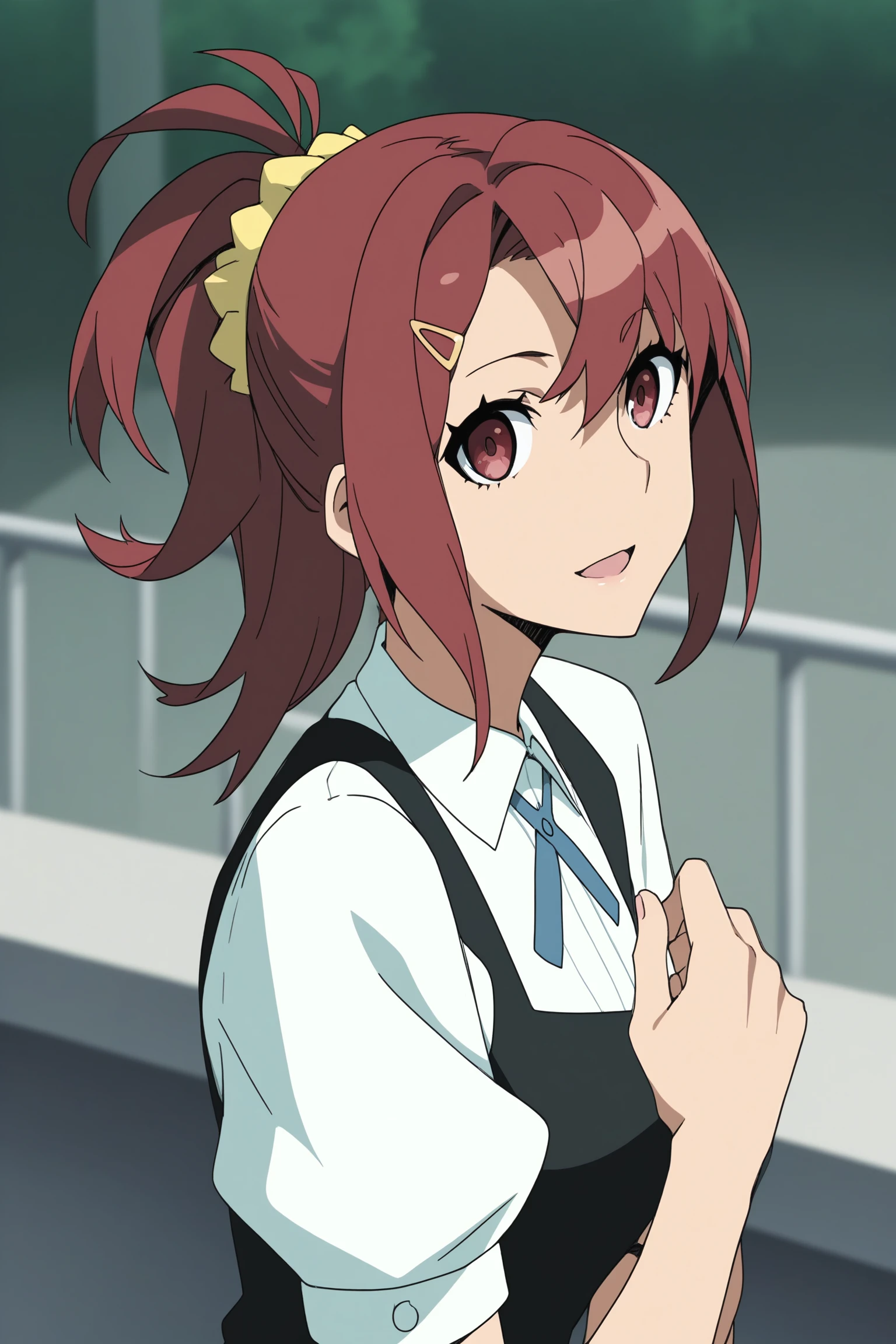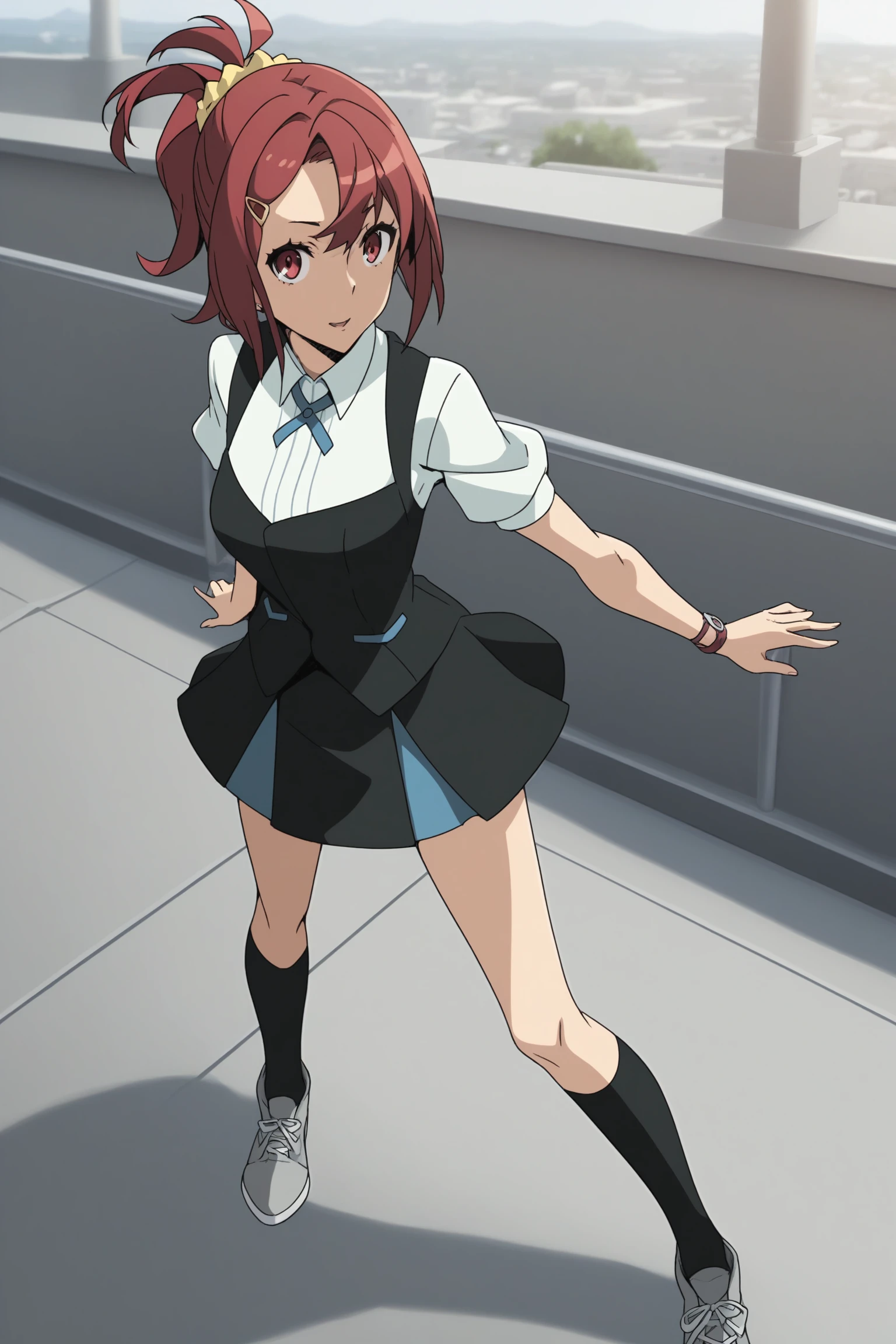 takashiro chidori, medium hair, red hair, high ponytail, yellow scrunchie, yellow hairclip, red eyes, school uniform, short sleeves, white shirt, collared shirt, black vest, blue neck ribbon, black skirt, pleated skirt, black kneehighs, grey-white sneakersNOTE