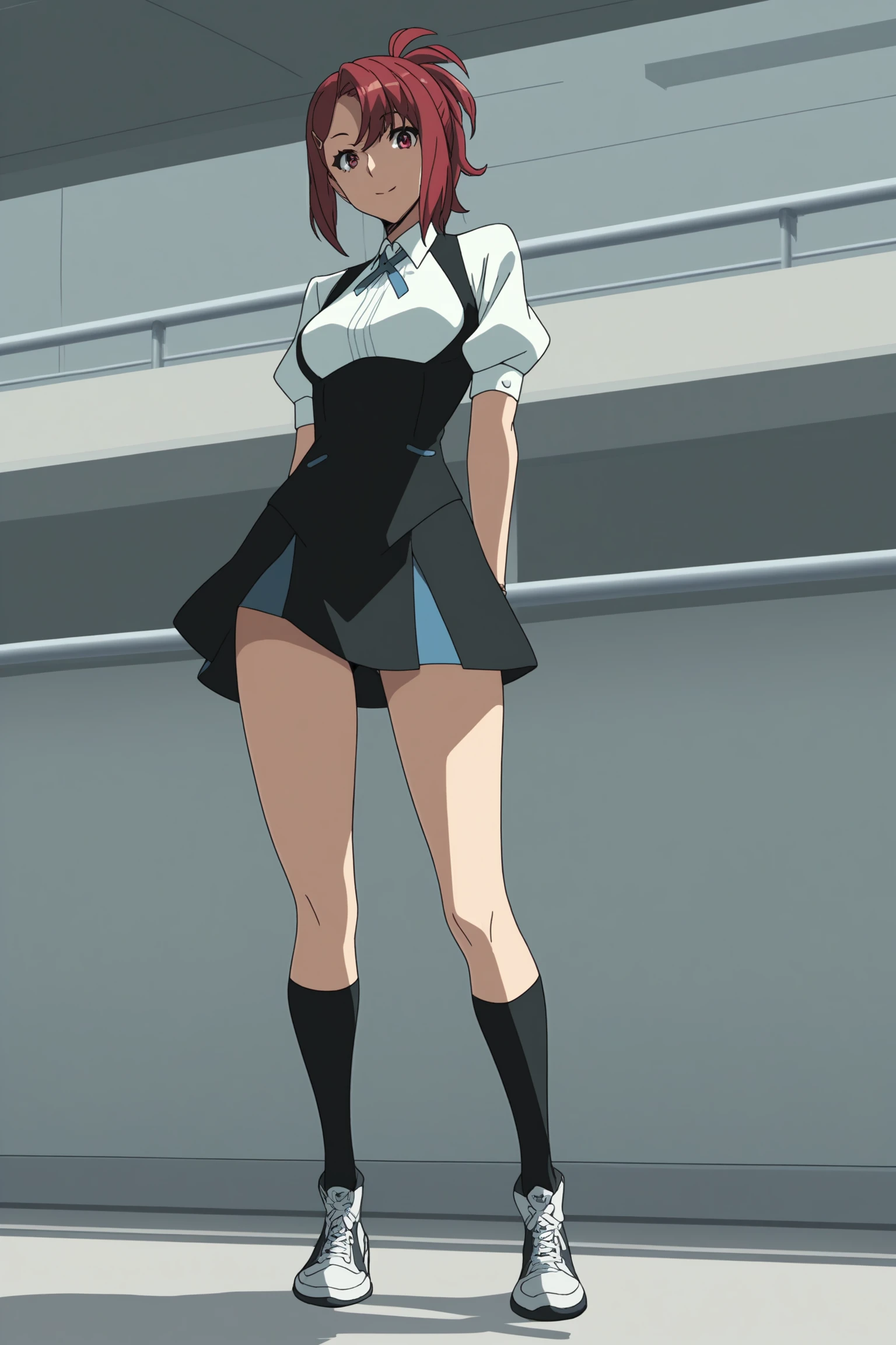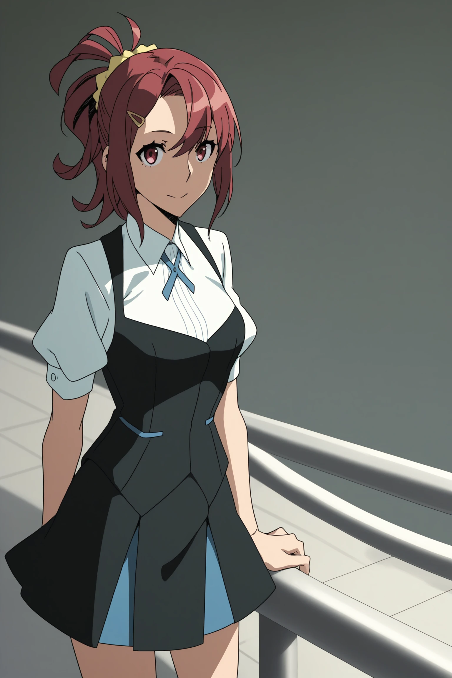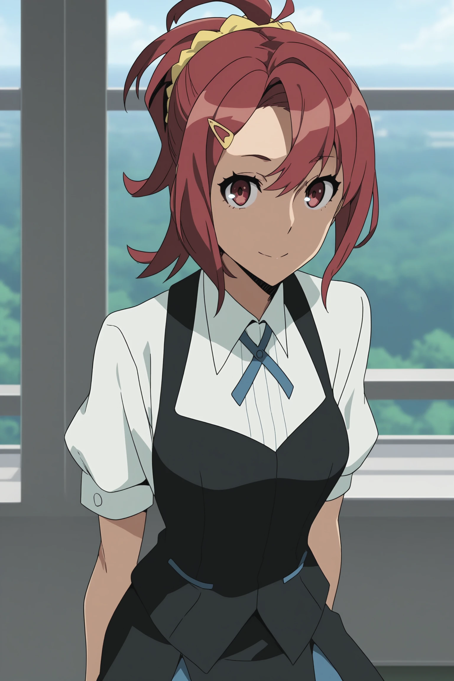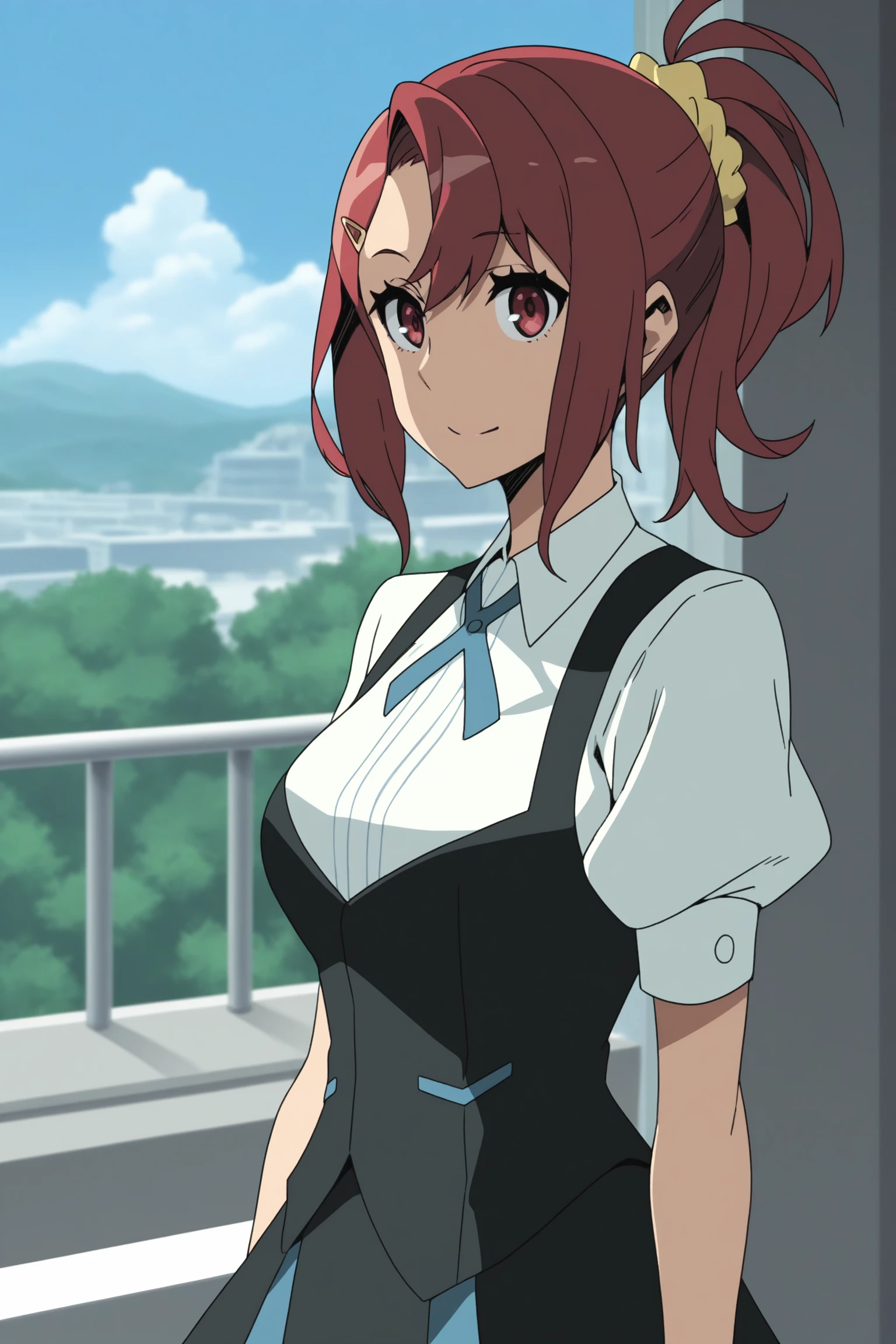 takashiro chidori, medium hair, red hair, high ponytail, yellow scrunchie, yellow hairclip, red eyes, school uniform, short sleeves, white shirt, collared shirt, black vest, blue neck ribbon, black skirt, pleated skirt, black kneehighs, grey-white sneakersNOTE