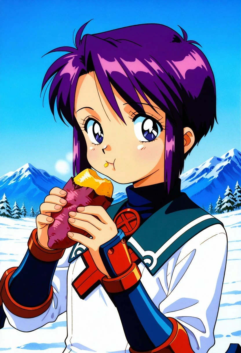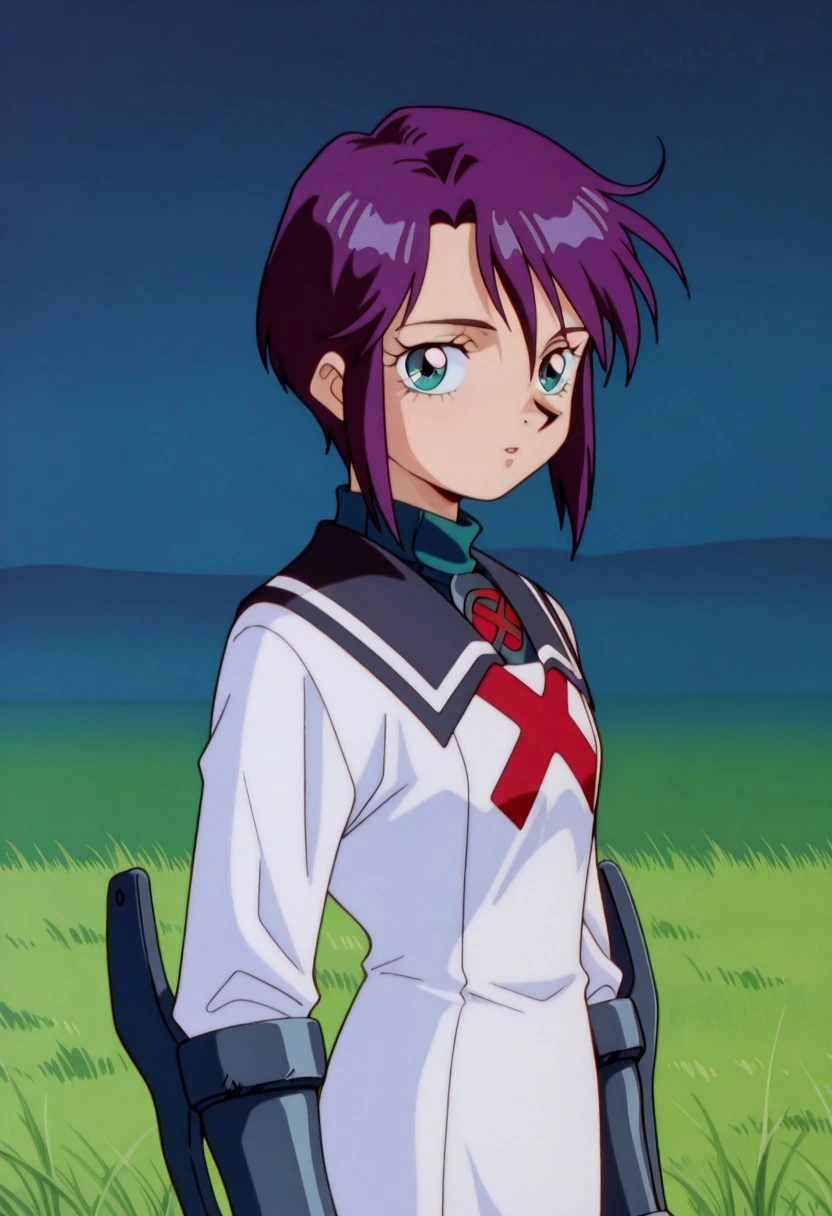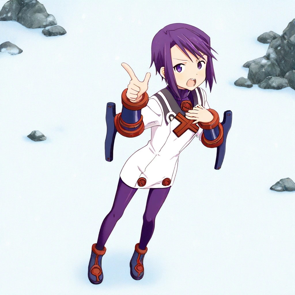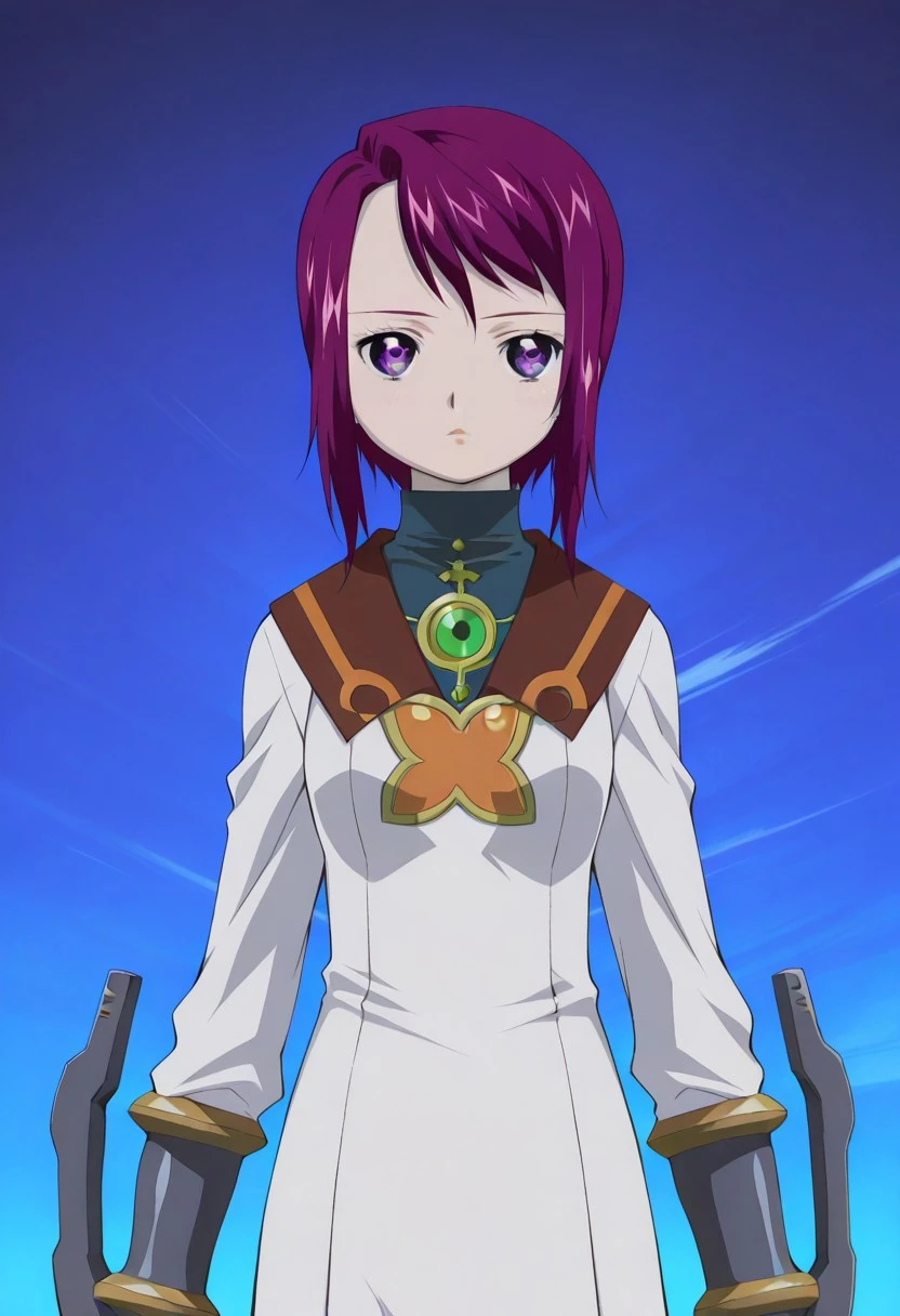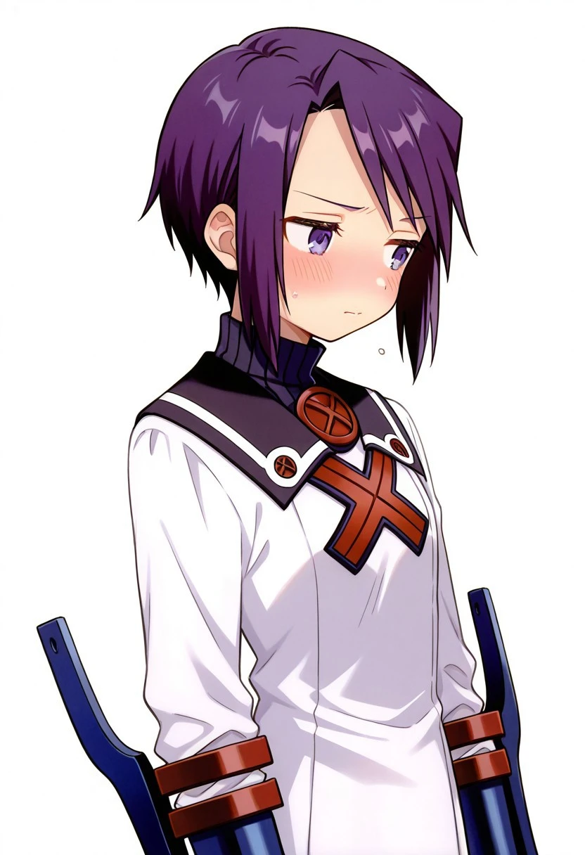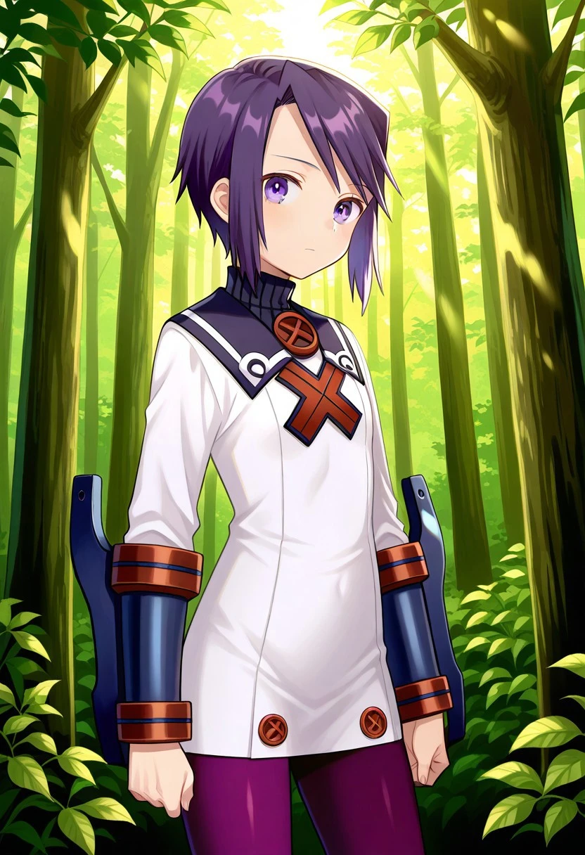 Prompt: toris_SN2, purple hair, short hair, bangs, sidelocks, short hair with long locks, turtleneck, sailor collar, white dress, short dress, dress, long sleeves, vambraces, pantyhose, purple pantyhose, ankle boots