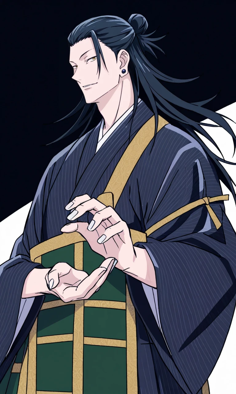 xiayoujie, second clothes, japanese clothes, getou suguru, 1boy, male focus, kesa, hair pulled back, black hair, long hair, single hair bun, black kimono, tabi, wide sleeves,
