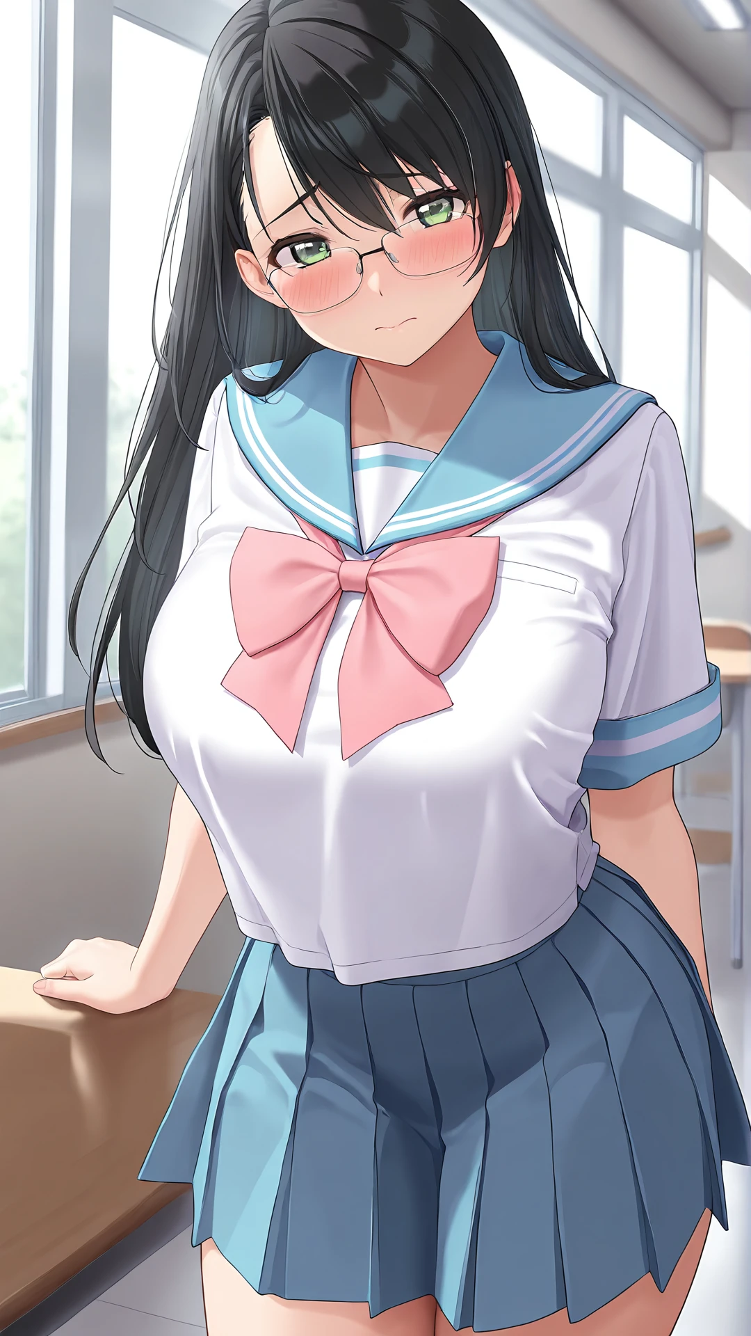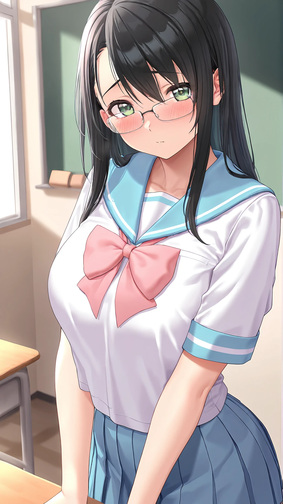 asouarisa,1girl,solo,school uniform,glasses,black hair,serafuku,long hair,skirt,green eyes,blush,bow,pleated skirt,