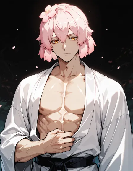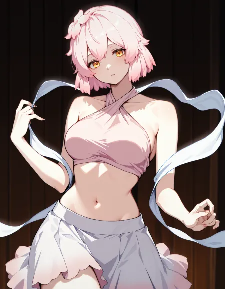 pink hair, peach blossom, orange eyes, tao fa, short hair, yellow eyes, midriff, skirt, halterneck, bare shoulders, shawl, bare arms