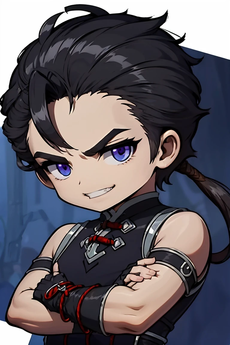 moxuan, long hair, looking at viewer, blue eyes, black hair, gloves, 1boy, purple eyes, ponytail, male focus, teeth, fingerless gloves, clenched teeth, low ponytail