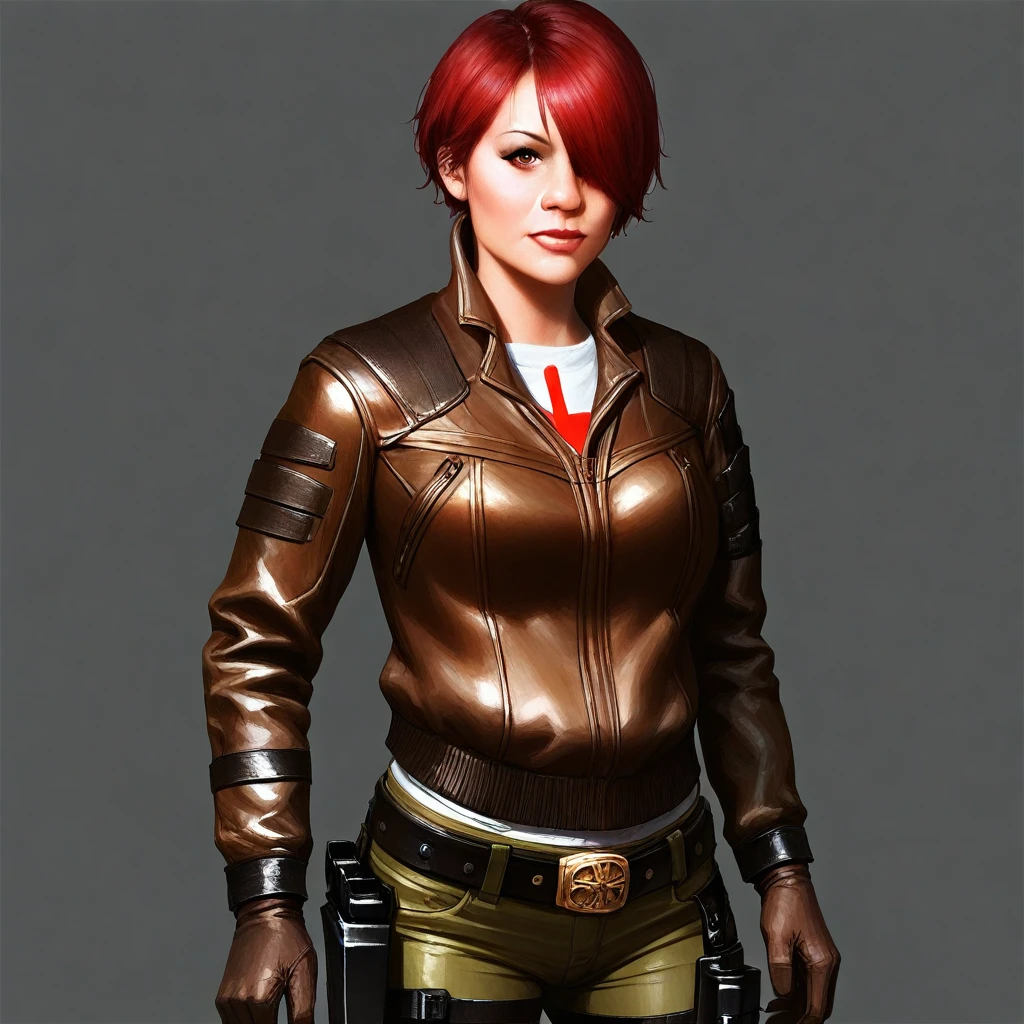 brown leather jacket, pants, gloves, belt, holsters, knee pads, boots,