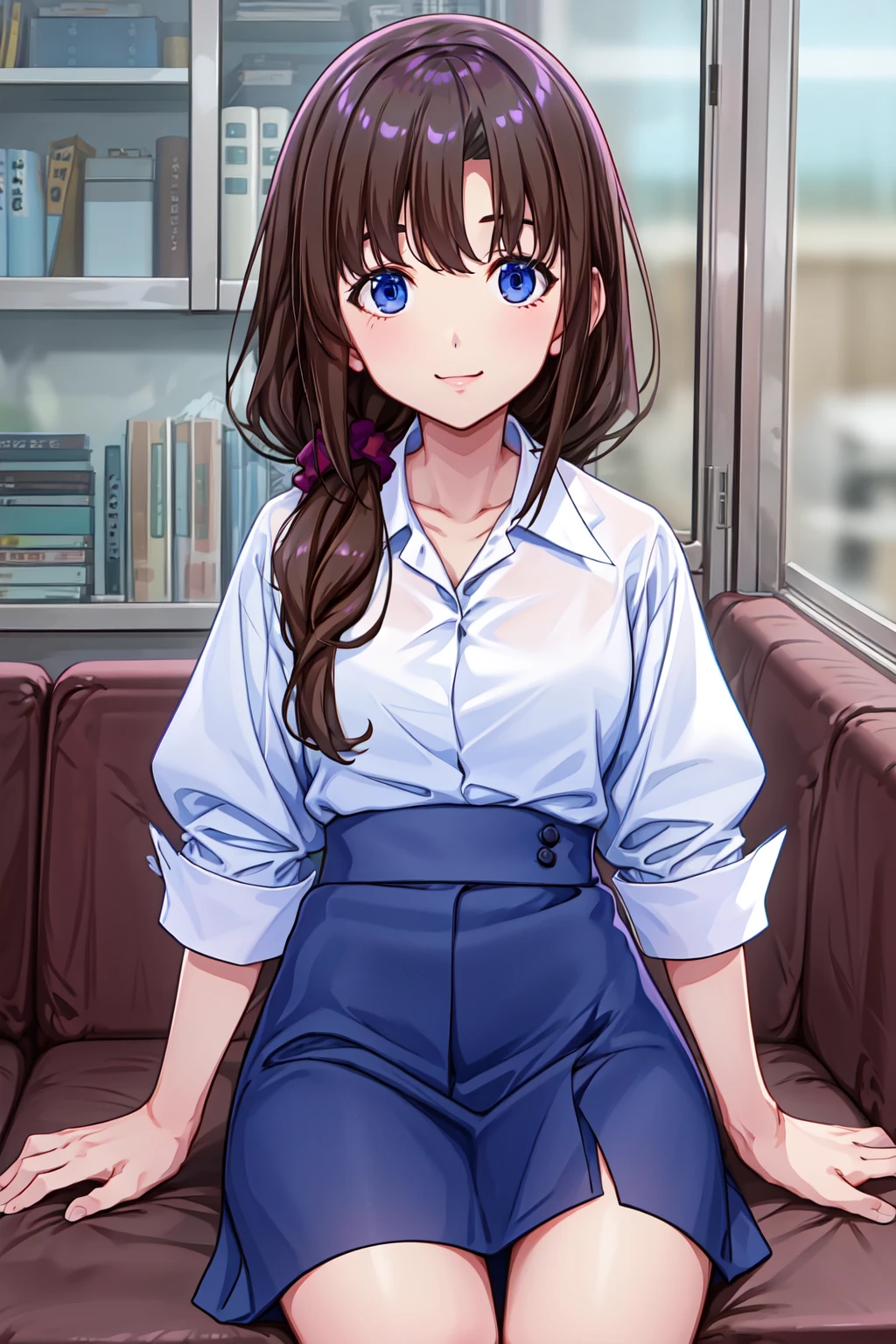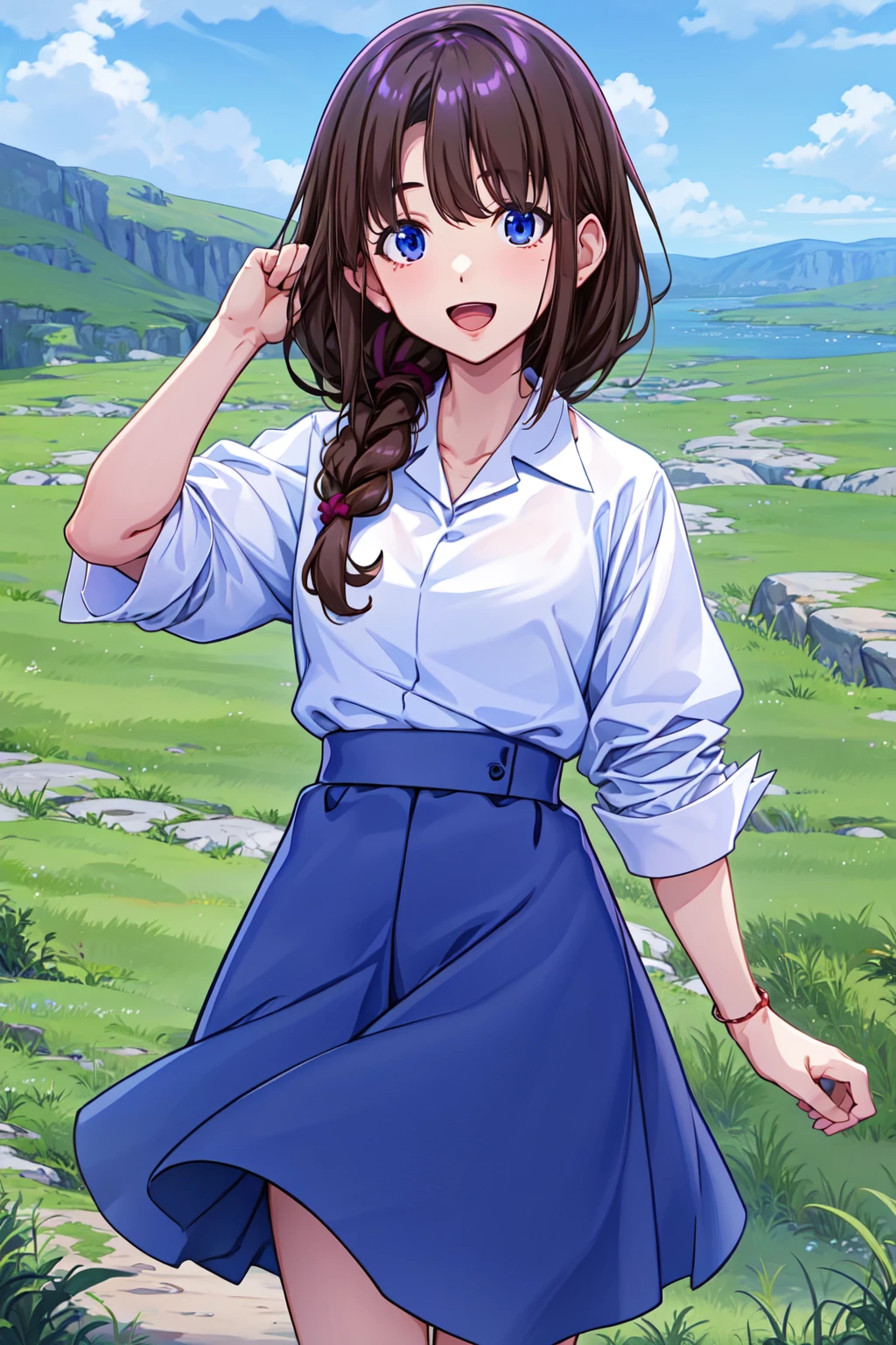 tantei1_ayumi, blue eyes, brown hair, long hair, bangs, single braid, hair over shoulder, hair scrunchie, white shirt, blue skirt,