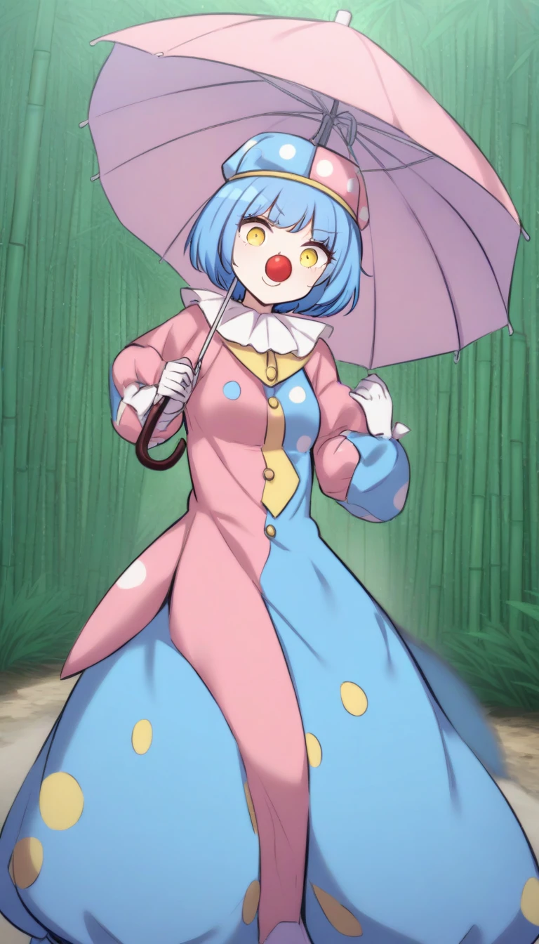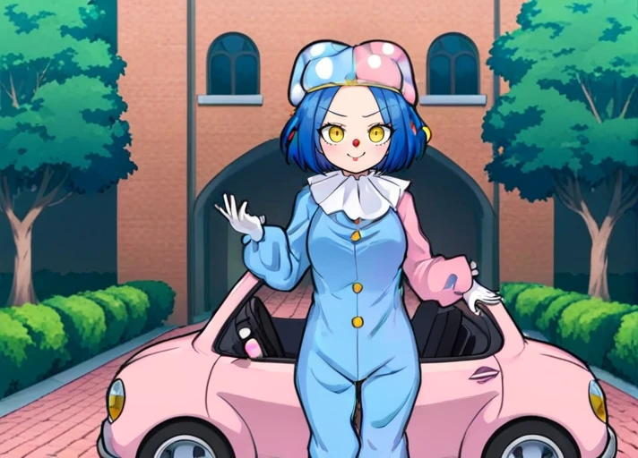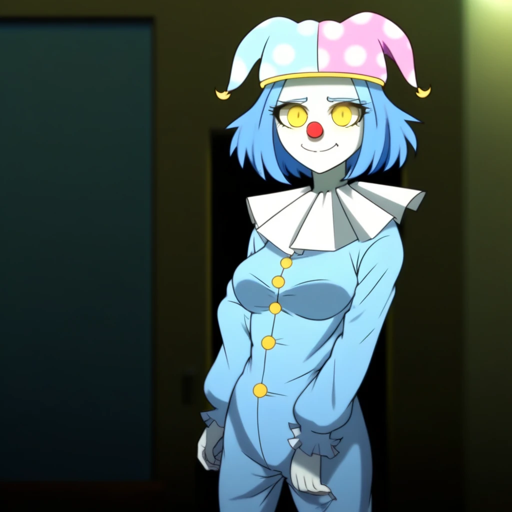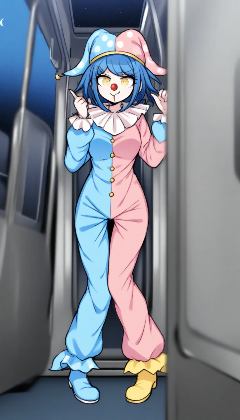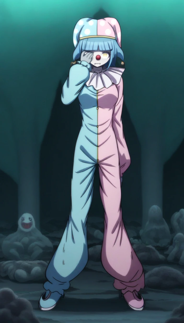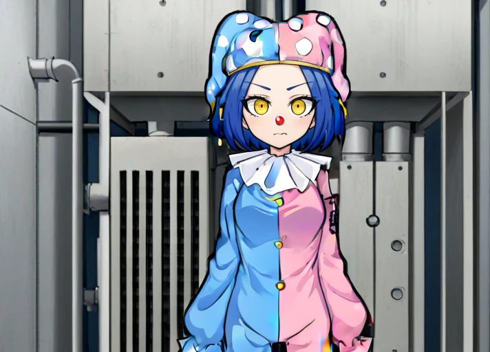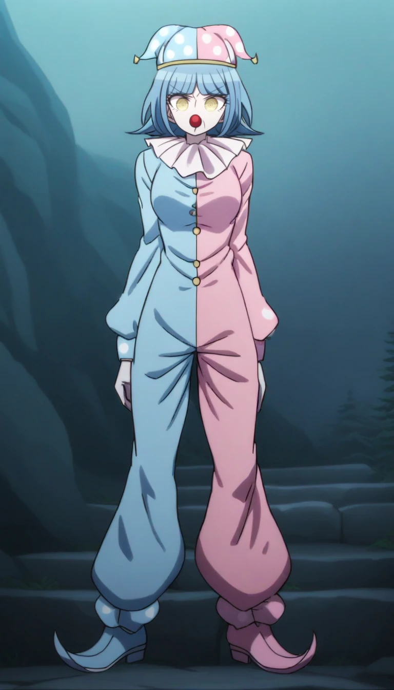 Standard clown outfit: "Satsuki Iranami is wearing a two-toned jester-like outfit split vertically down the middle with blue on the left side and pink on the right, and a matching jester's cap with white polka dots and a yellow band. Her costume features a white ruffled collar, yellow buttons down the front and curled shoes. Satsuki has short blue hair and striking yellow eyes. She wears a red clown nose."