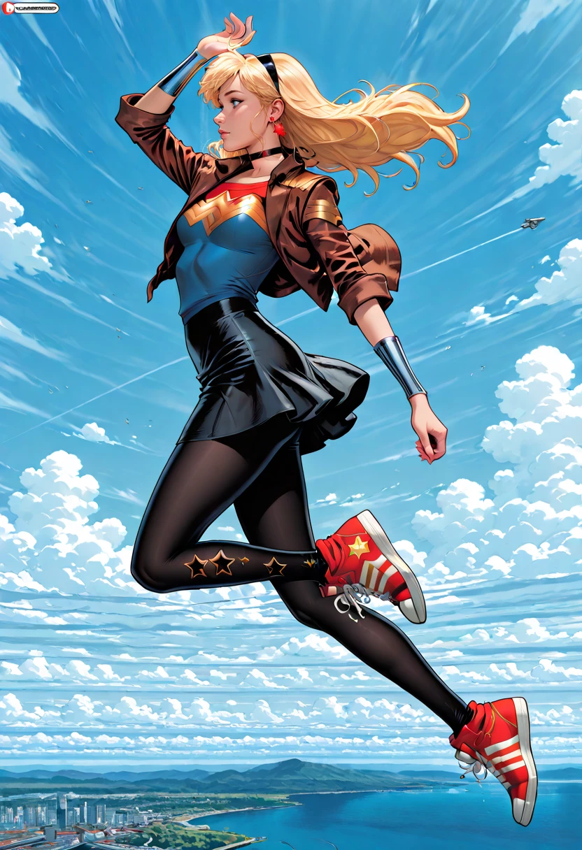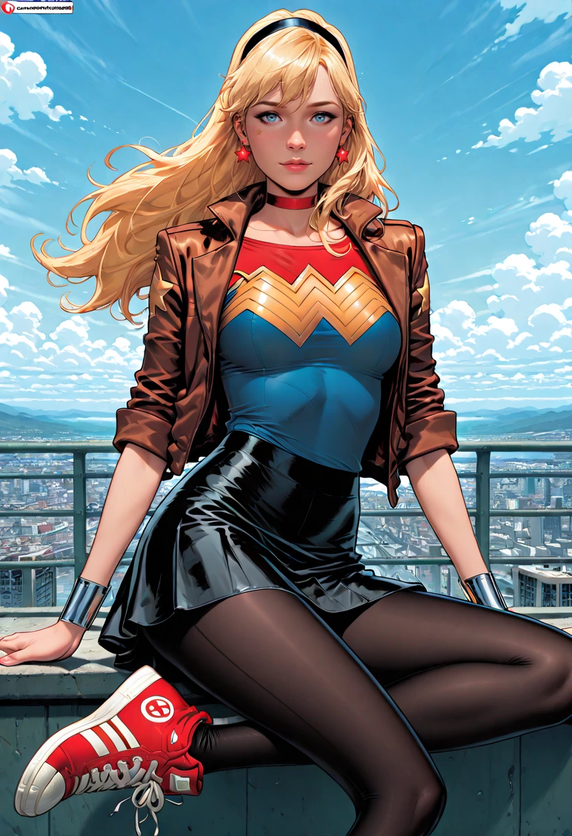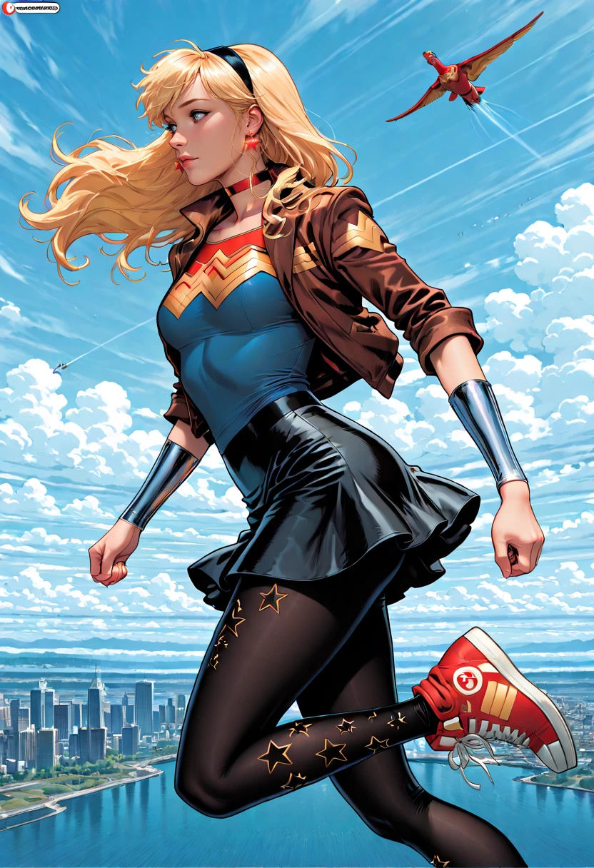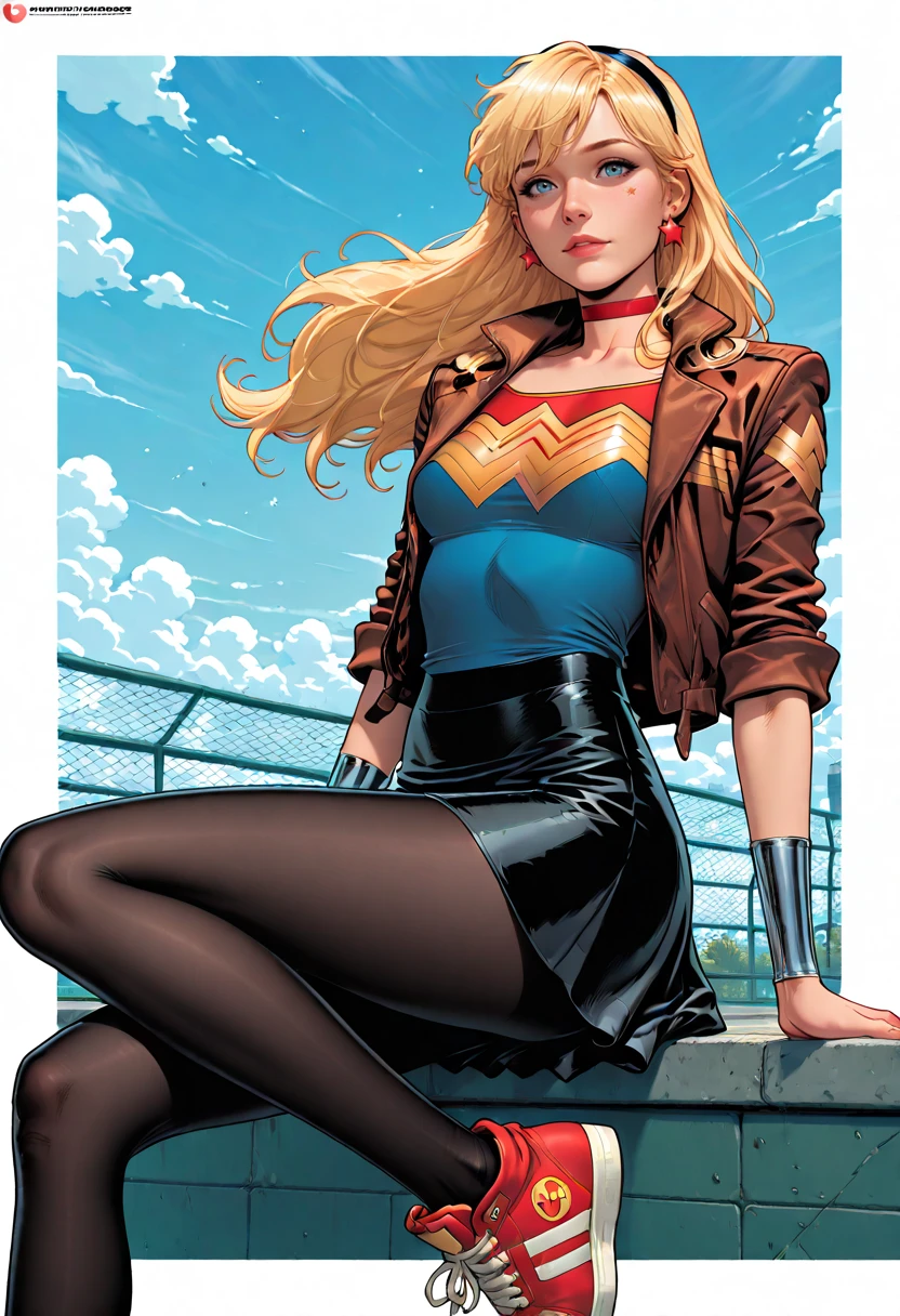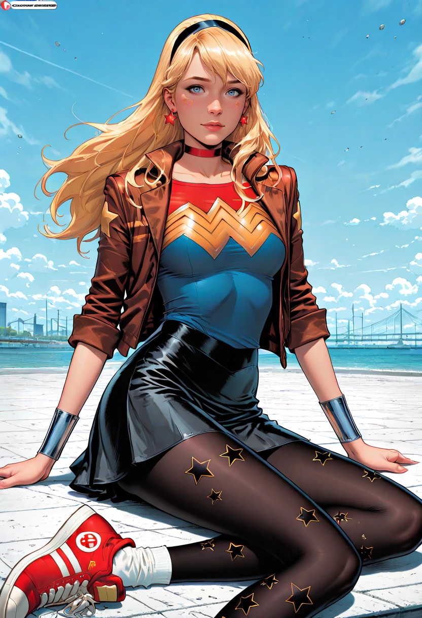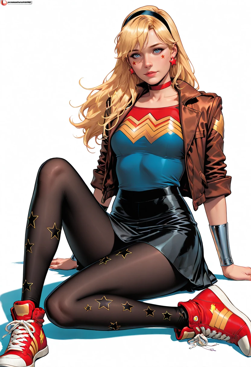Cassie Sandsmark, wonder girl, long hair, blonde hair, hairband, brown jacket, jacket, short skirt, black skirt, black pantyhose, star \(symbol\), red and blue t-shirt, t-shirt, choker, star earrings, silver bracers, sneakers, blue eyes, western comics \(style\)