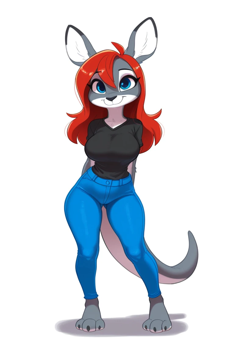 p4ol4, furry female, kangaroo girl, kangaroo tail, blue eyes, two-tone fur, red hair