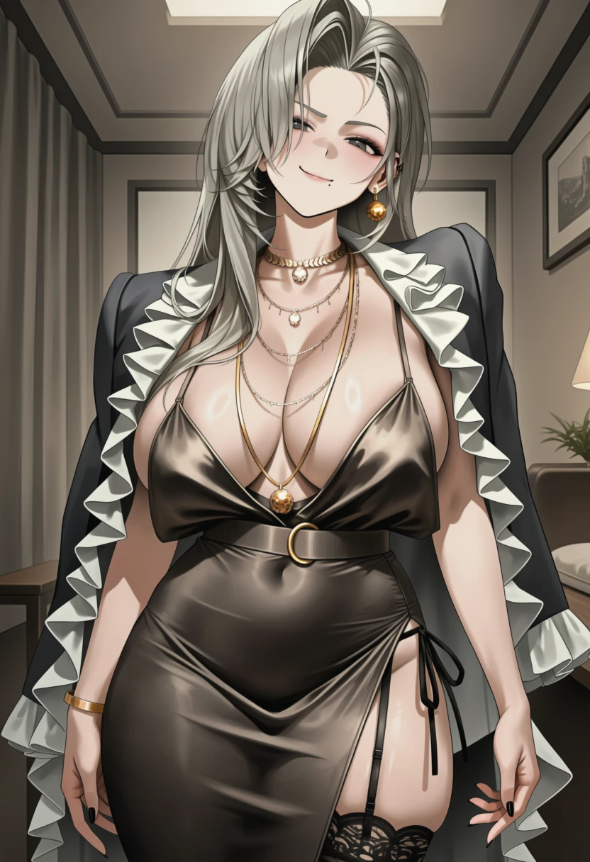 mrs. miss \(nikke\), long hair, grey hair, grey eyes, mole under mouth, mole on , single earring, gold necklace, bracelet