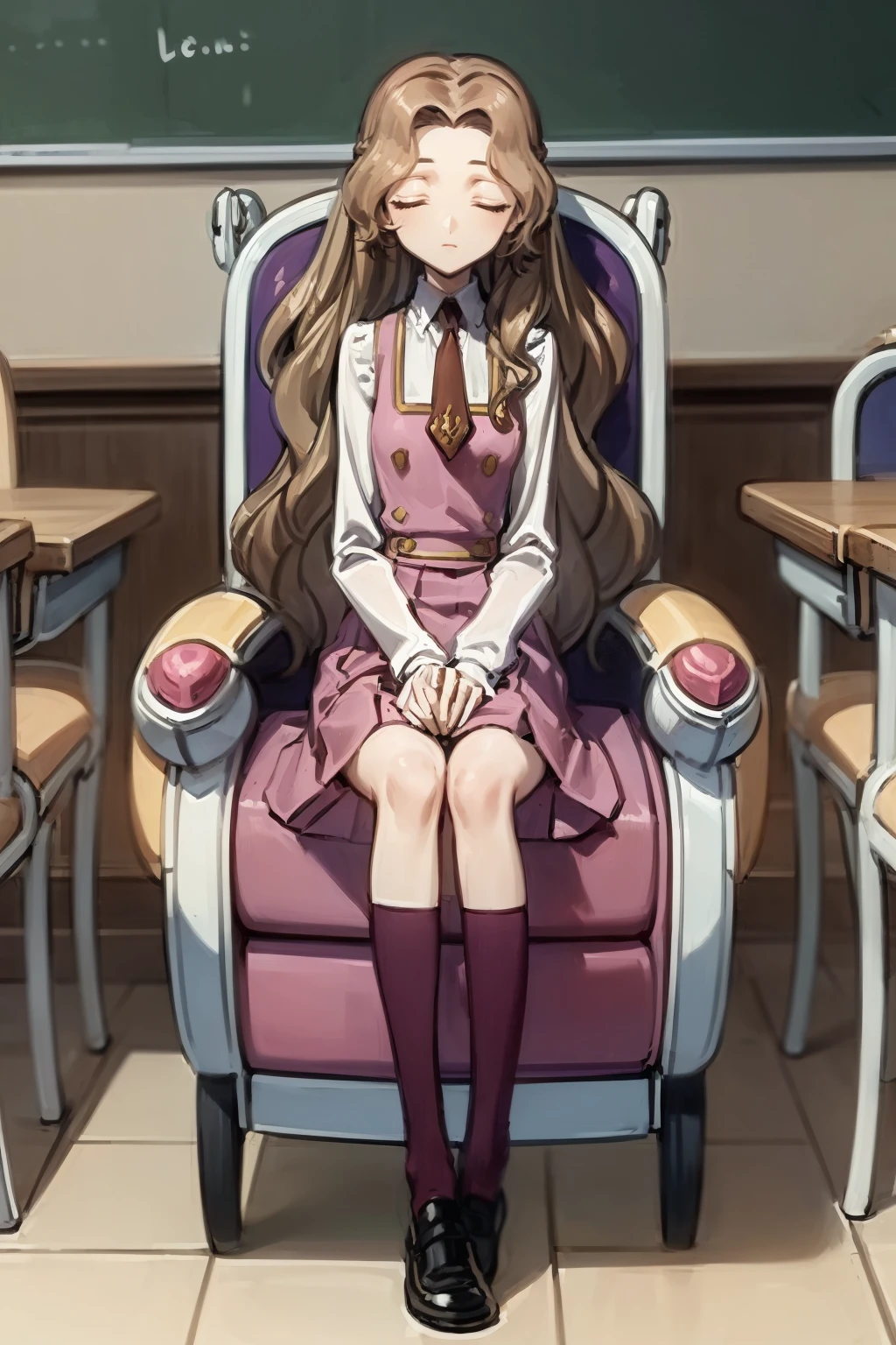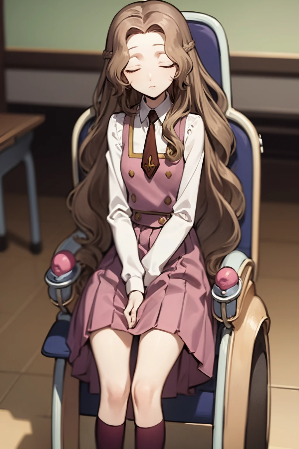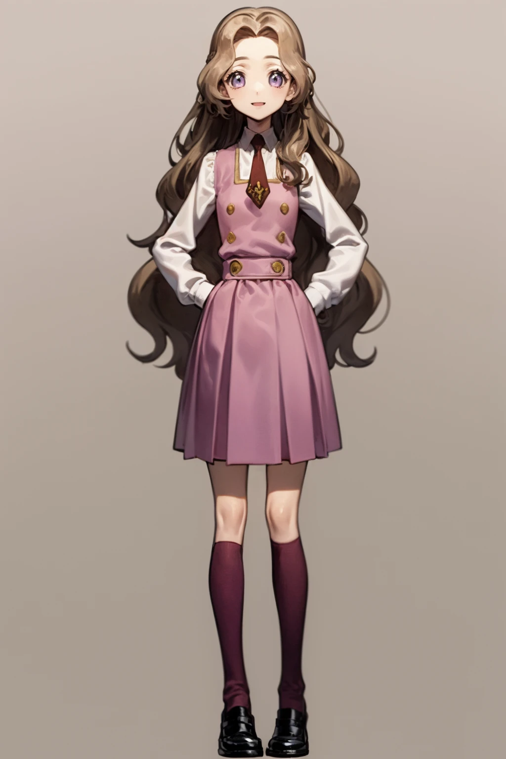 School Uniform prompts : school uniform, ashford academy school uniform, kneehighs, necktie, pinafore dress, long sleeves, shirt, white shirt, pink dress, shoes