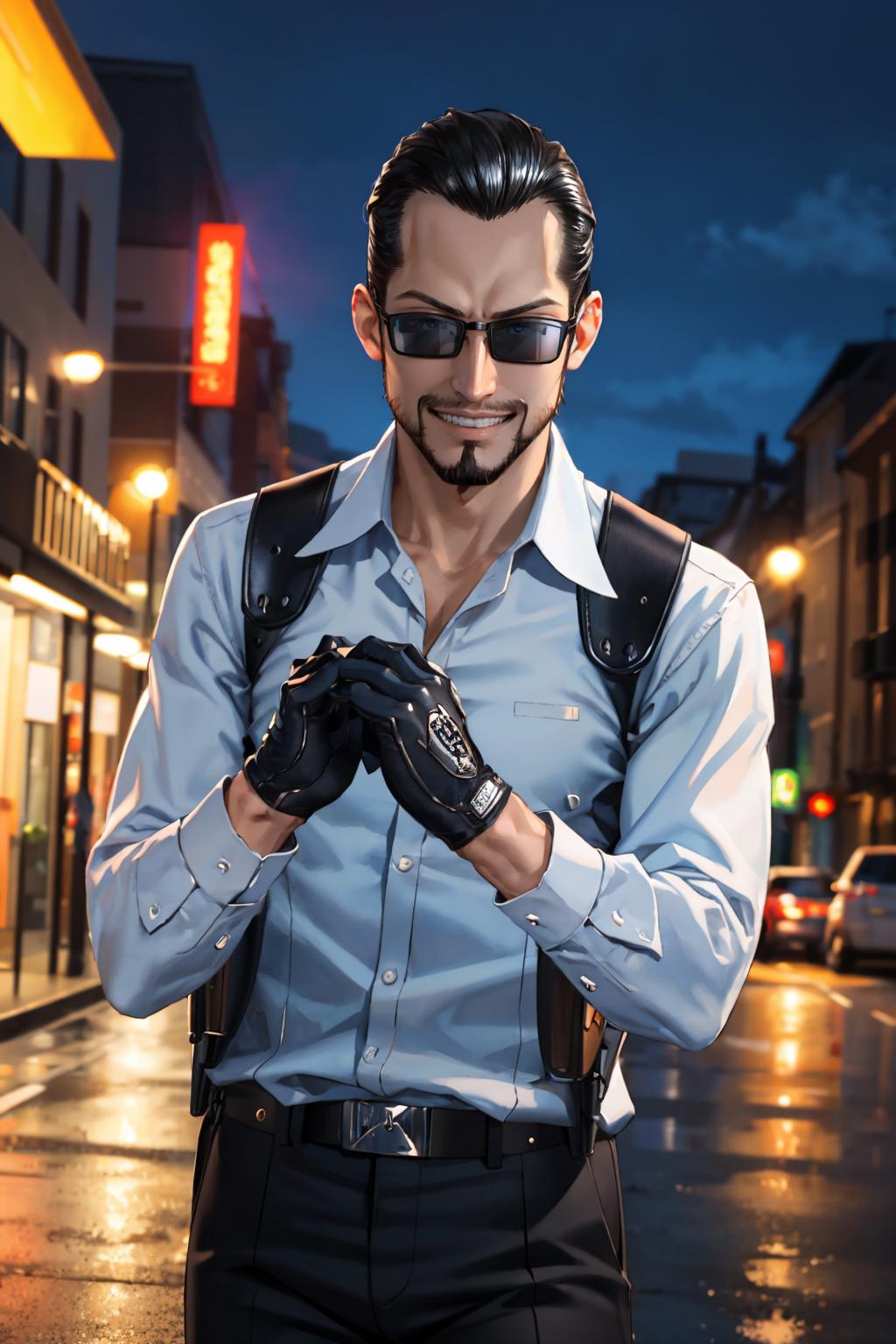 finnegansh, sunglasses, black hair, beard, shirt, gloves, holster, black pants
