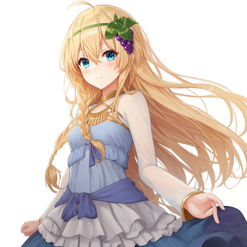 1girl, solo, blonde hair, long hair,hair between eyes, blue eyes,ahoge, braid, hair ornament,grapes, blue dress, long sleeves, gradient dress, layered dress, dress,
