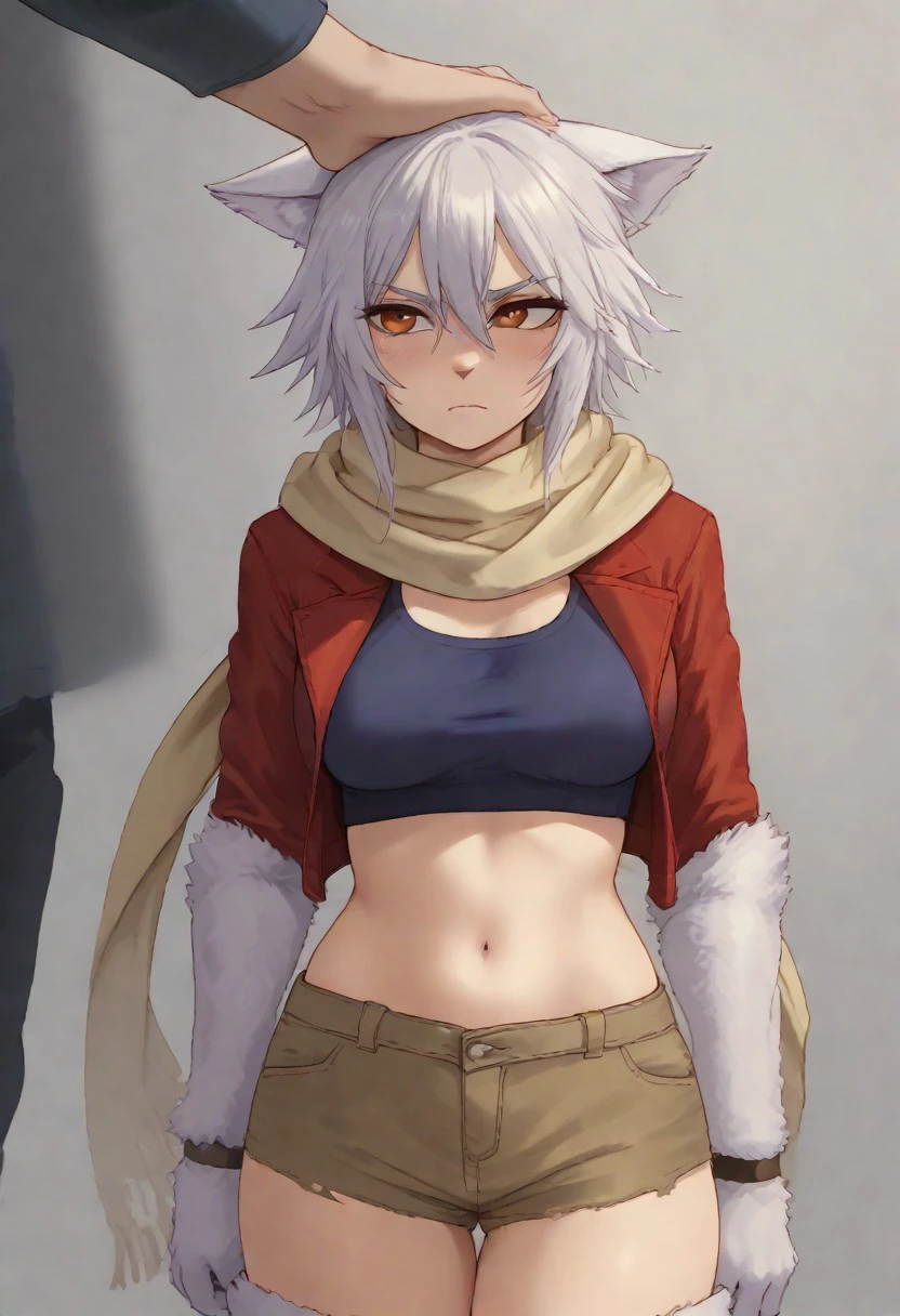 Clothes trigger words: red jacket, cropped top, brown shorts, scarf, armband, legband
