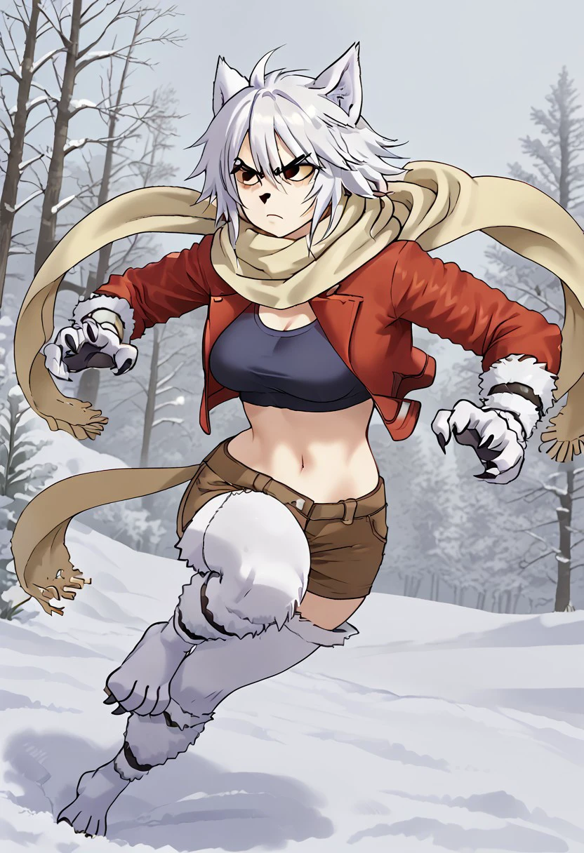flake, yellow eyes, white hair, wolf ears, animal hands, animal feet, tail