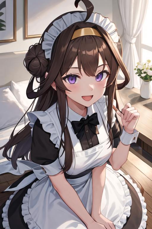 brown_hair, long_hair, ahoge, hairband, hair_bun, double_bun, headgear, smile, nontraditional_miko, purple_eyes, open_mouth