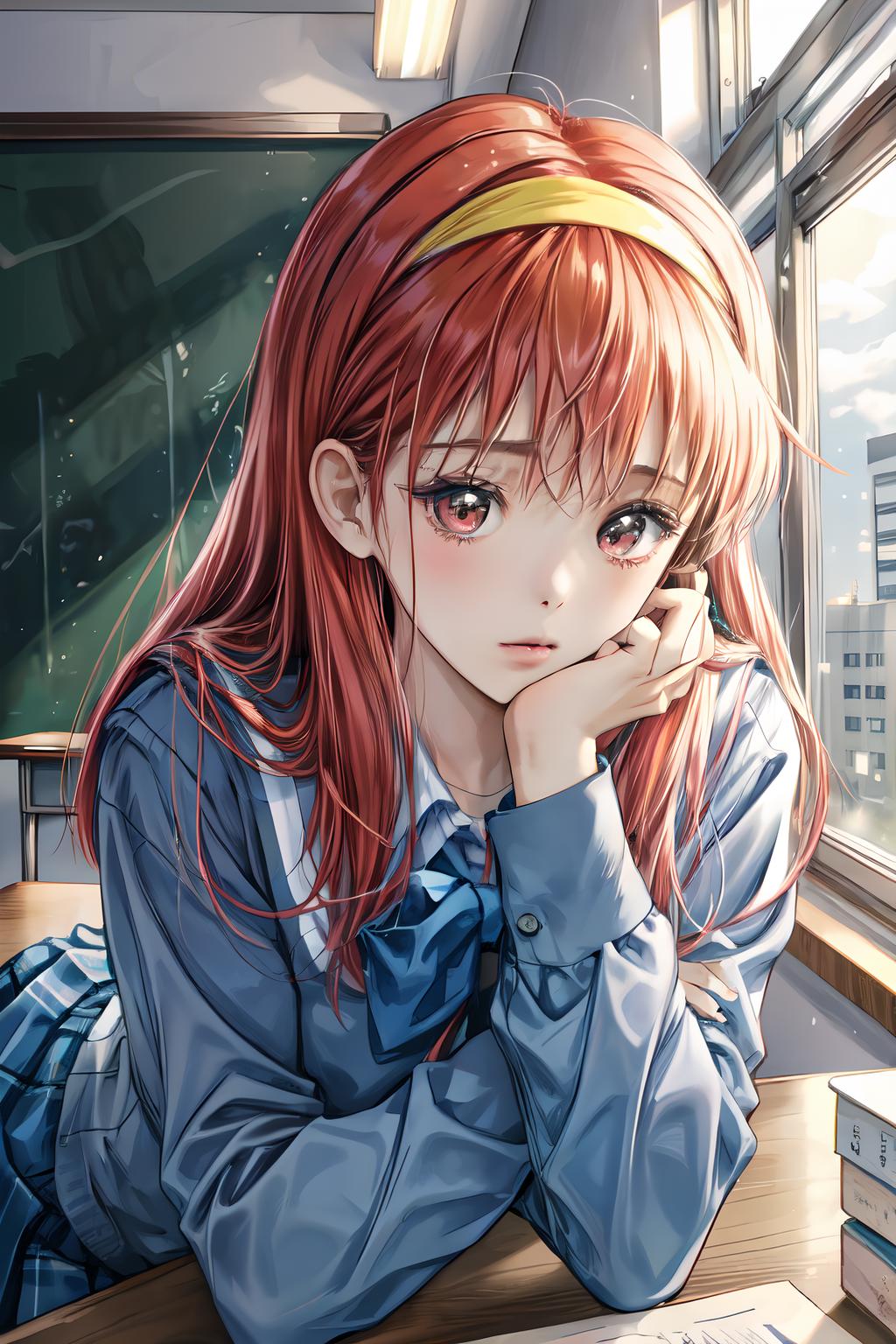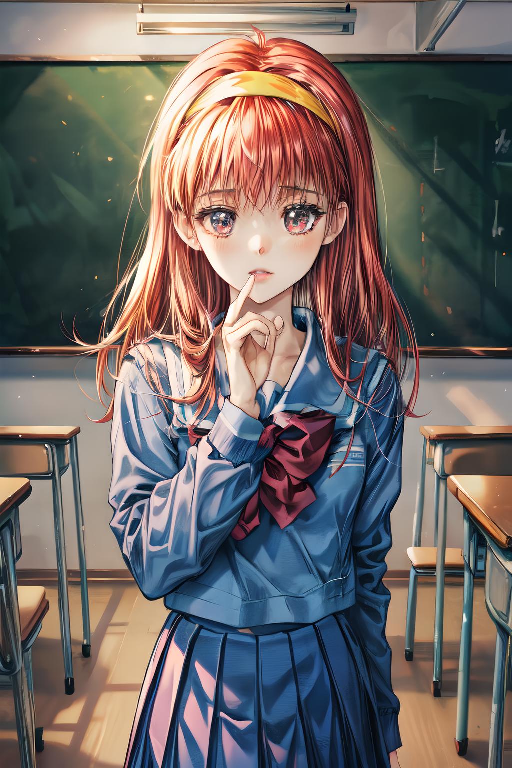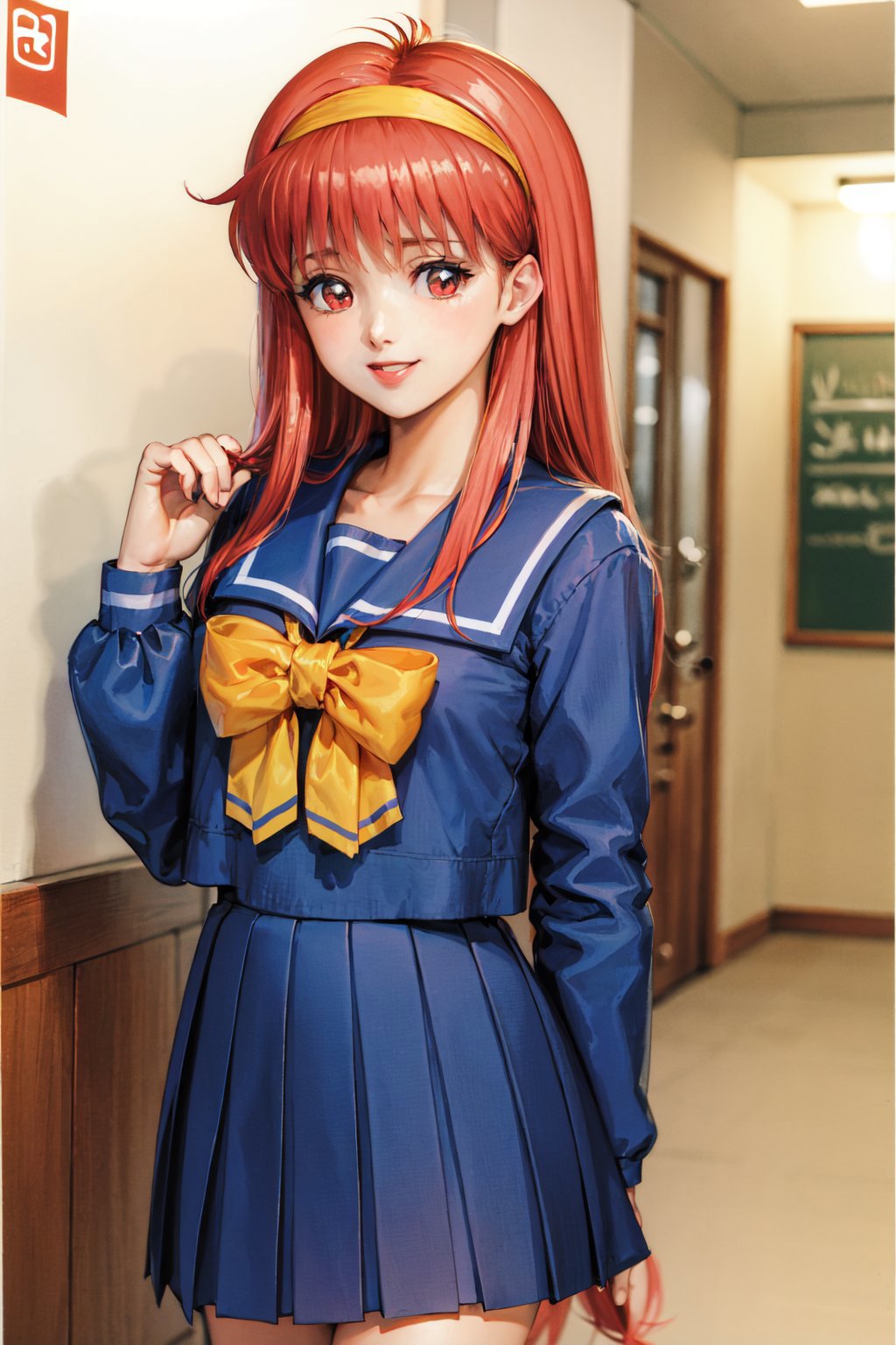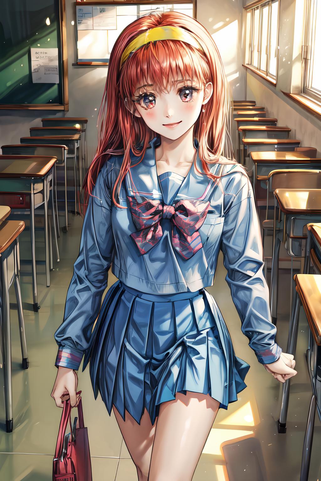 Default Outfit: yellow hairband, school uniform, serafuku, long sleeves, pleated skirt