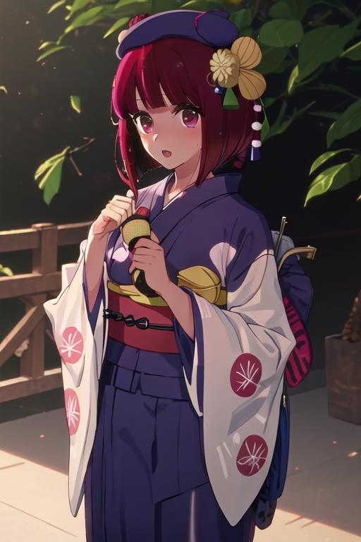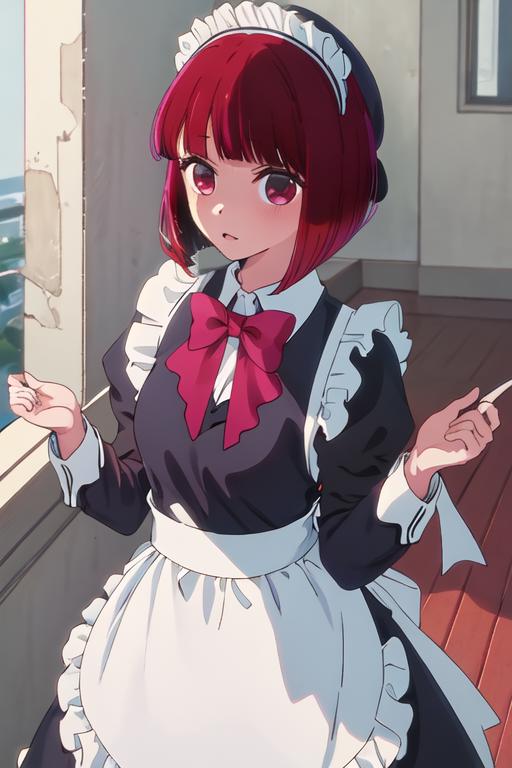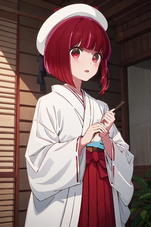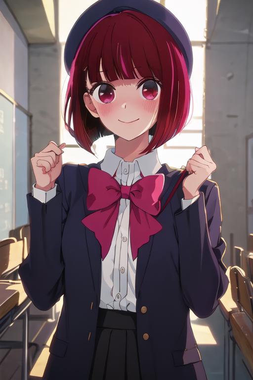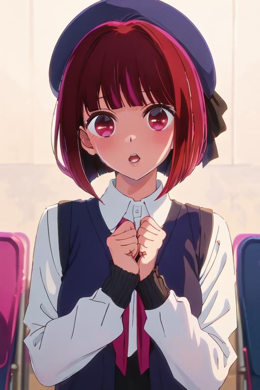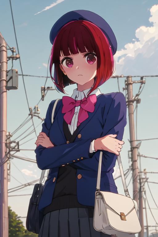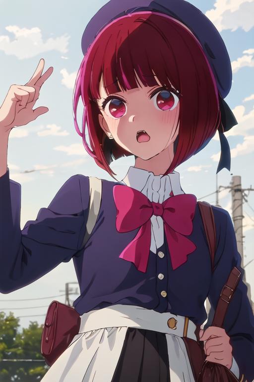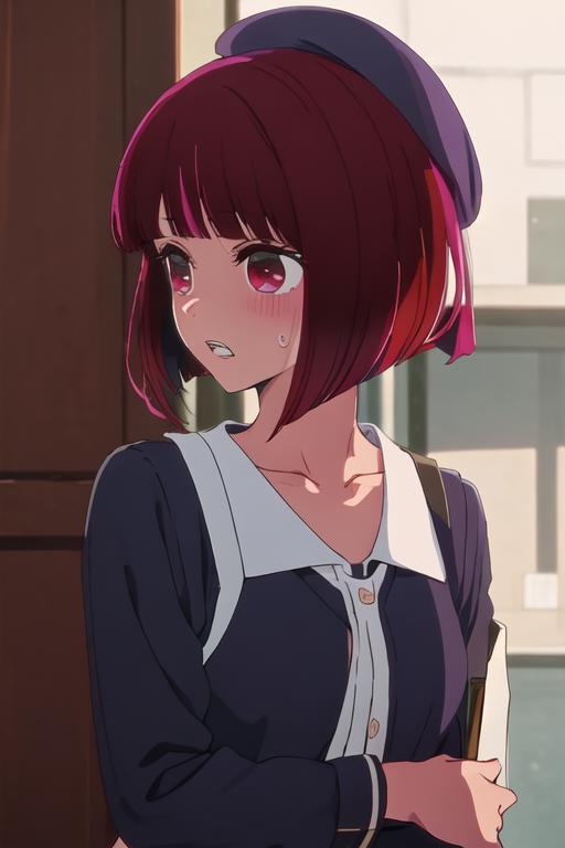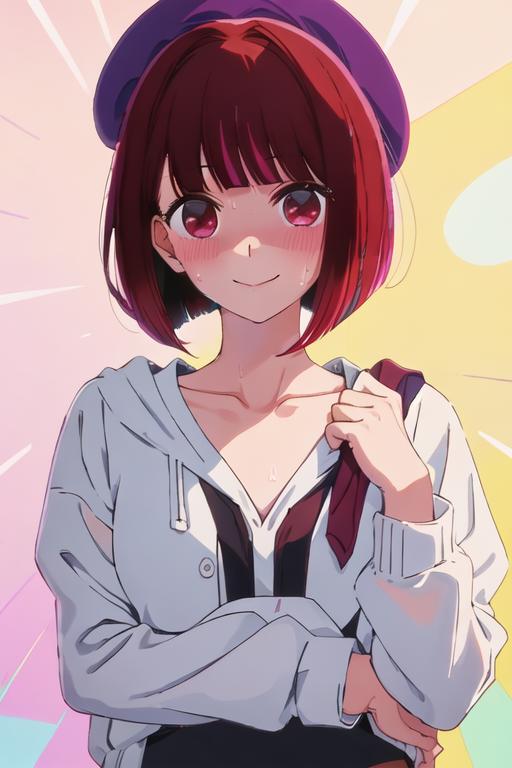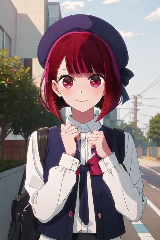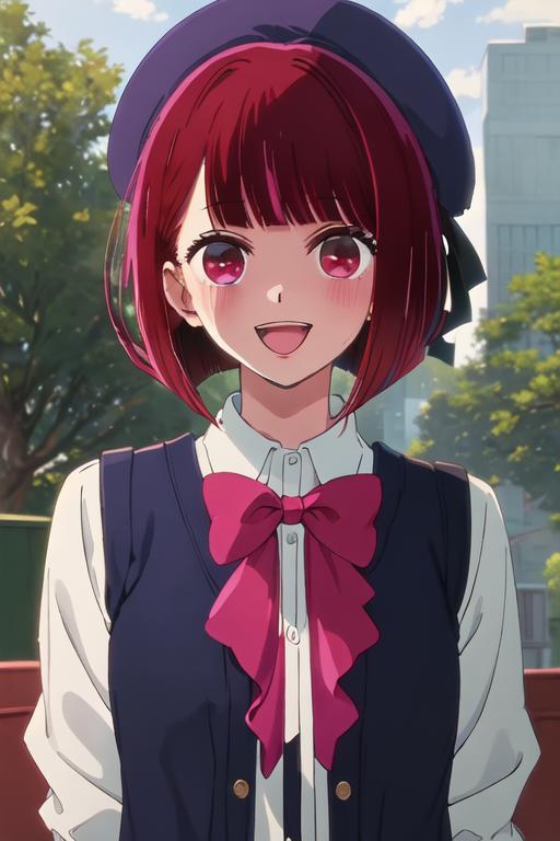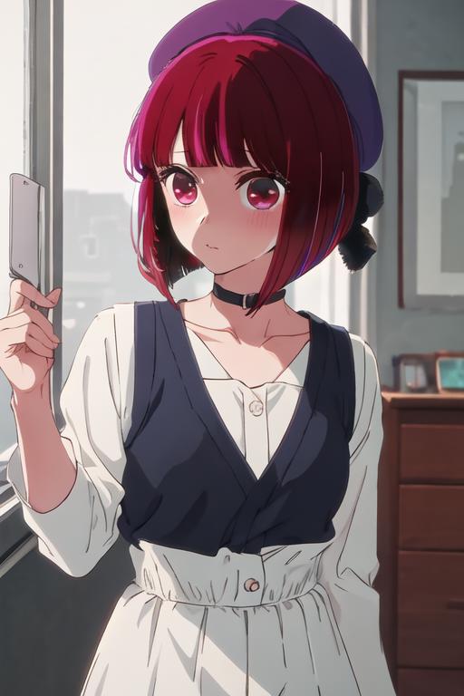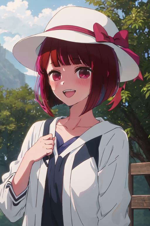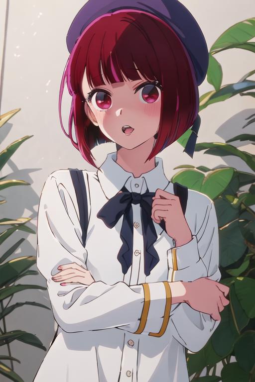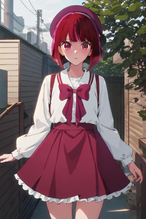 The trigger word is arima_kana_oshinoko, and the recommended tags are best quality, masterpiece, highres, solo, {arima_kana_oshinoko:1.15}, short_hair, bangs, red_hair, blunt_bangs, bob_cut, red_eyes, hat.