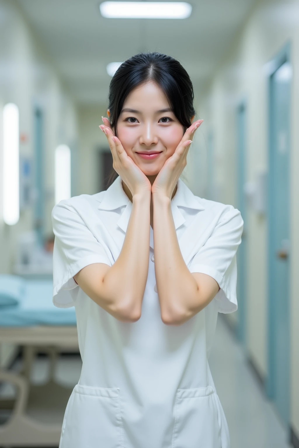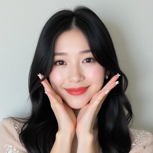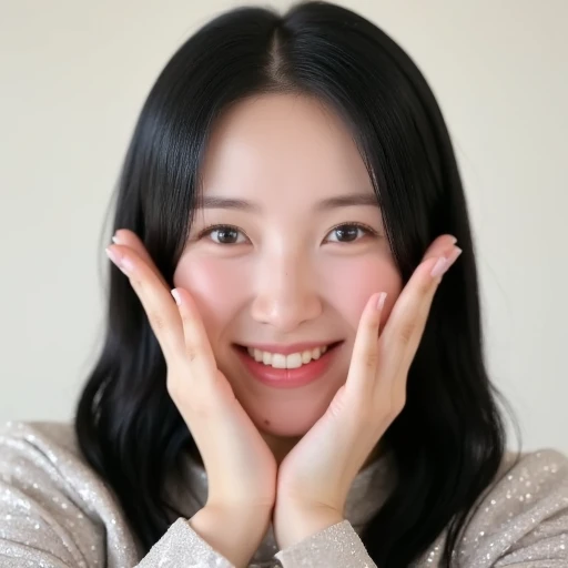 • hands raised, palms facing each other, with her fingers gently touching her cheeks