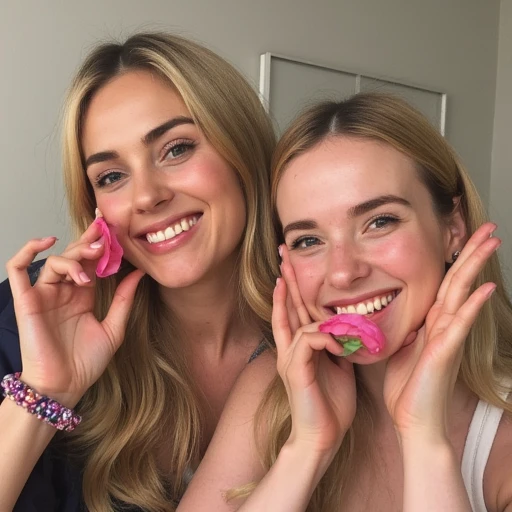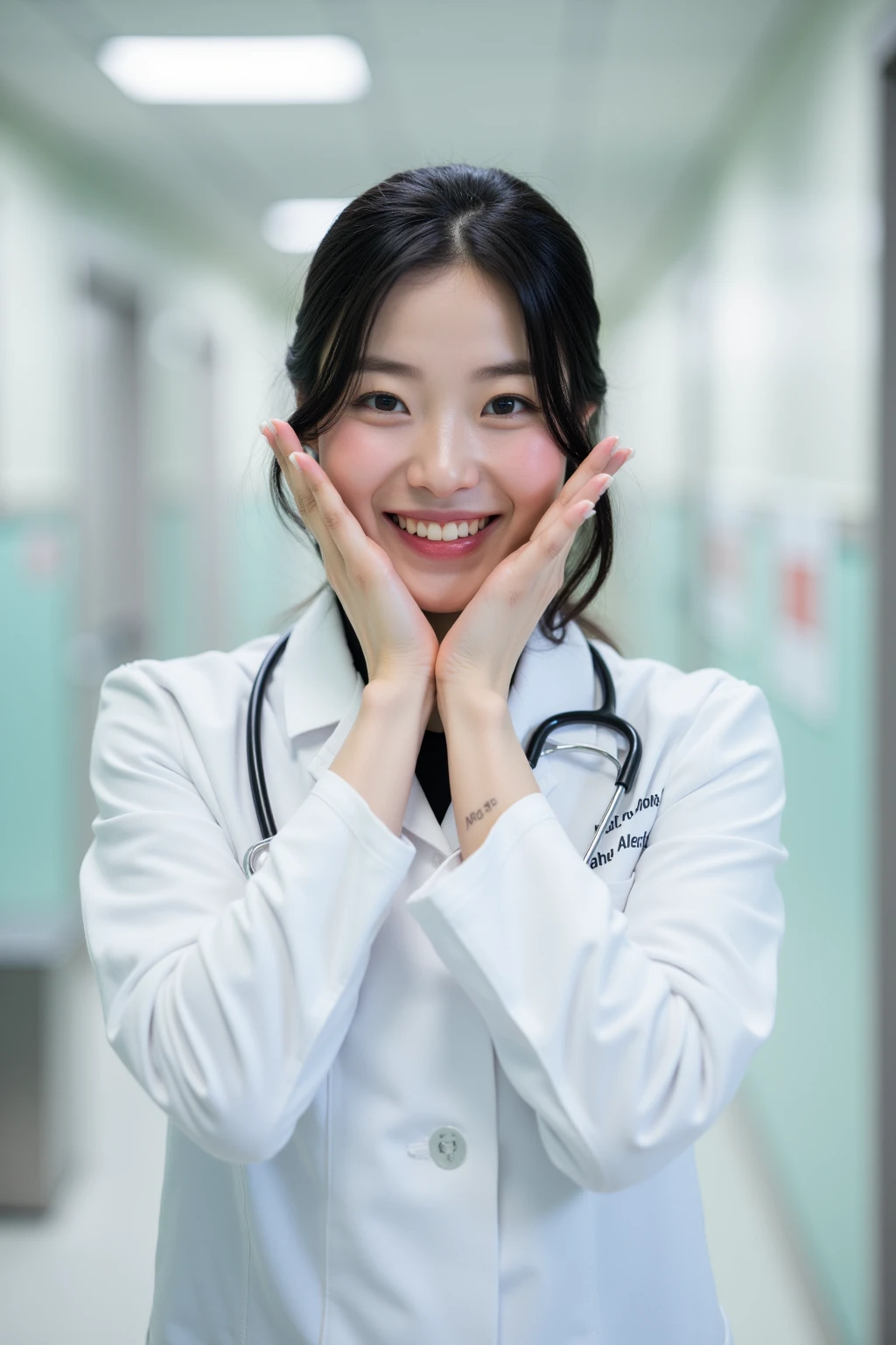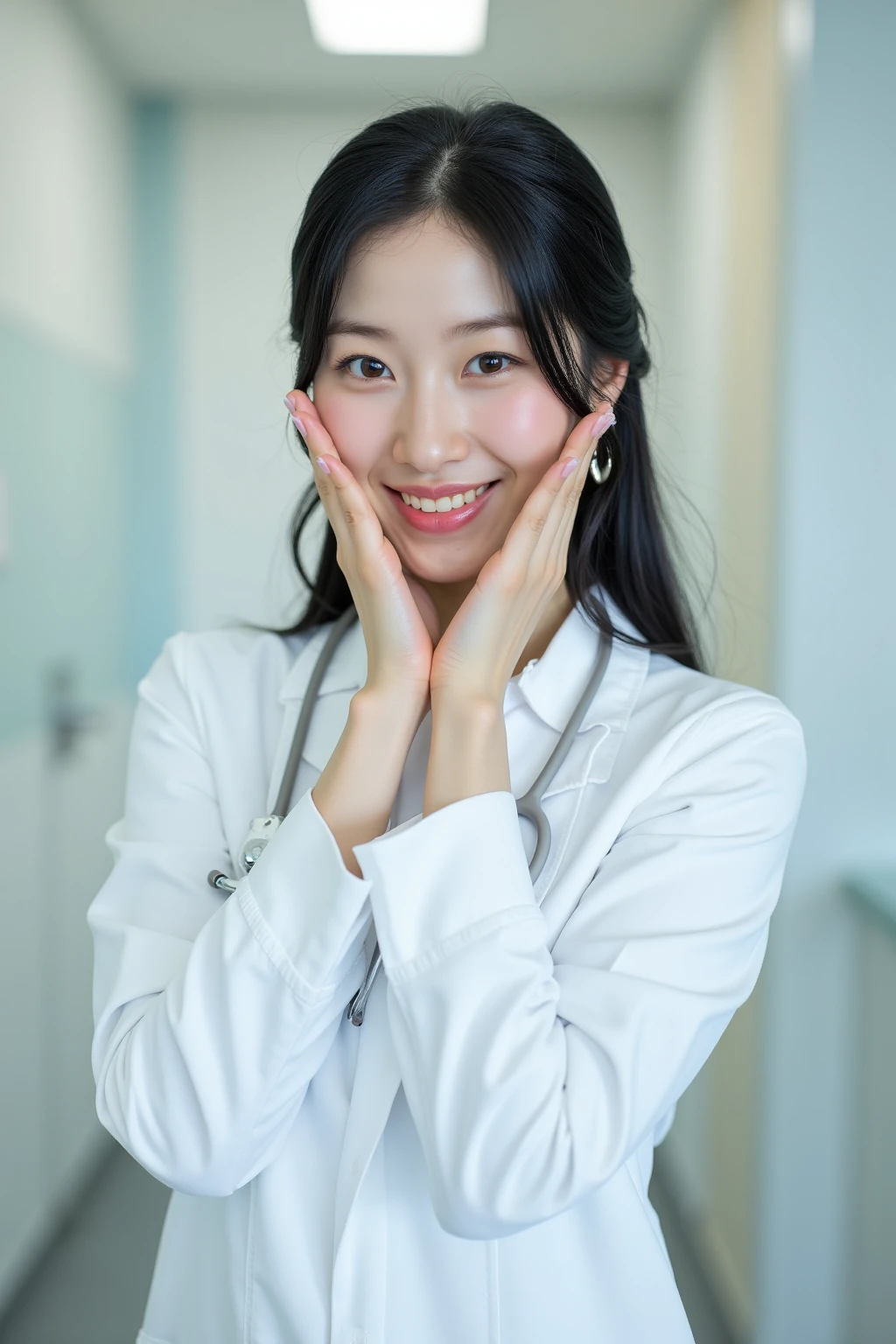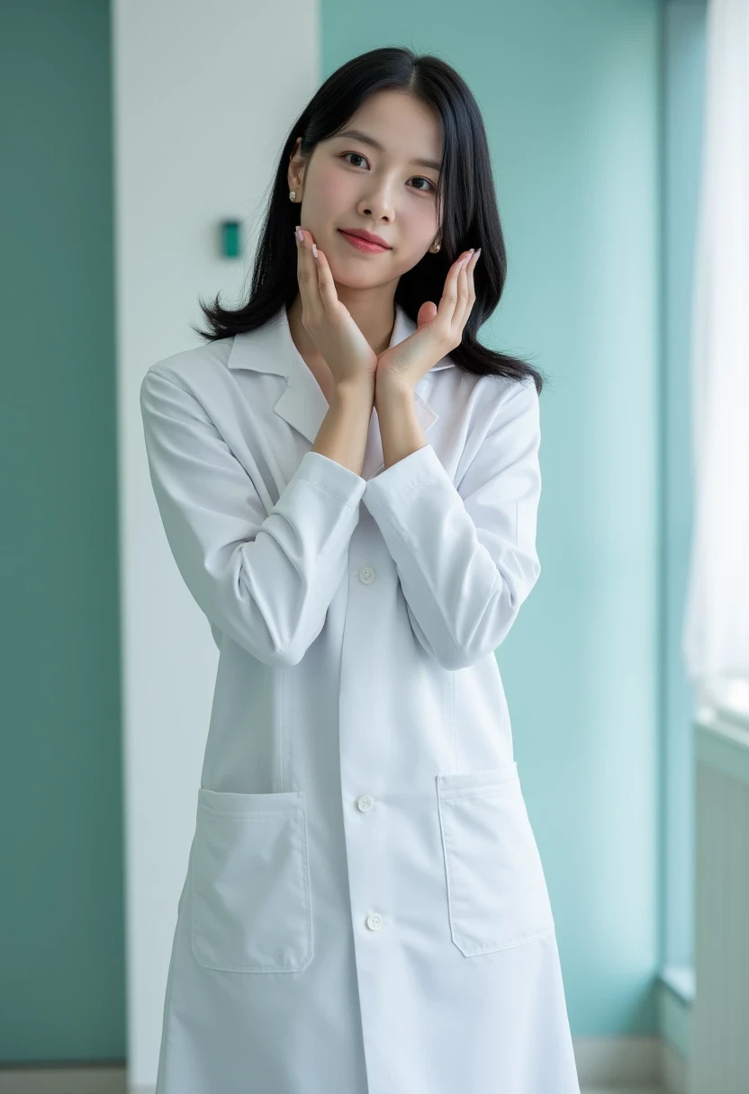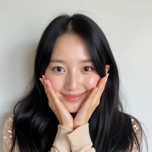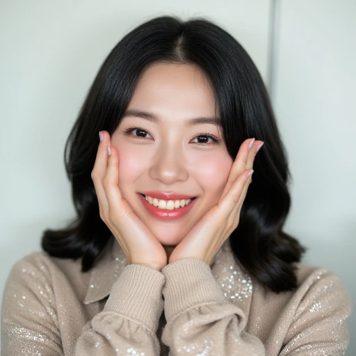 • hands raised, palms facing each other, with her fingers gently touching her face, framing her face and enhancing the playful, affectionate expression