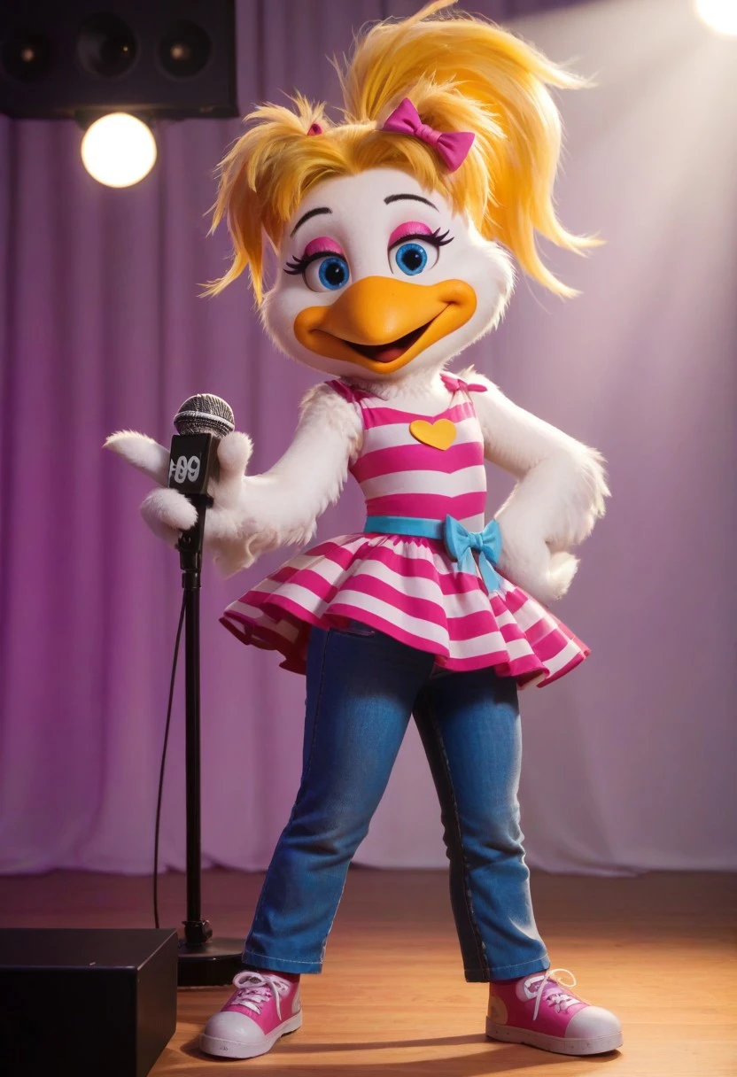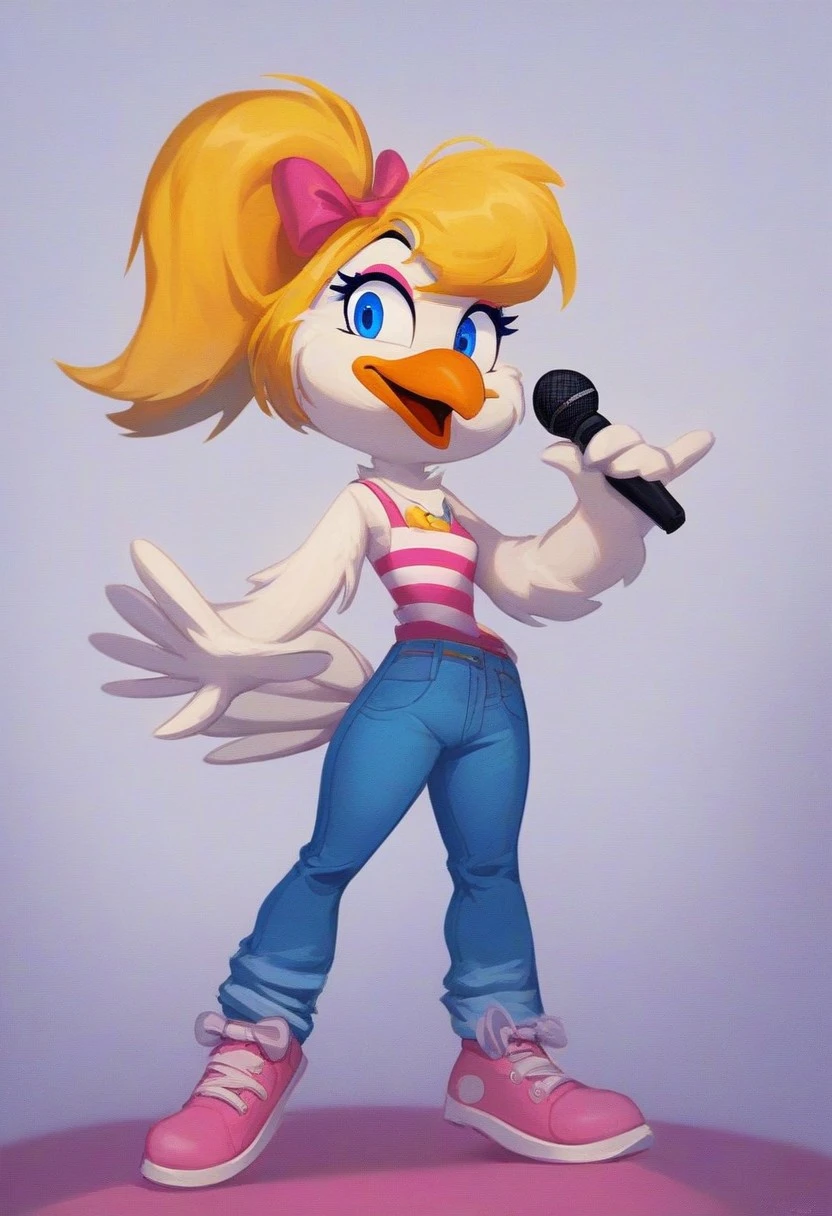 furry, bird girl, blue eyes, makeup, blonde hair, ponytail, bow, striped dress, denim pants, pink shoes, 2010
