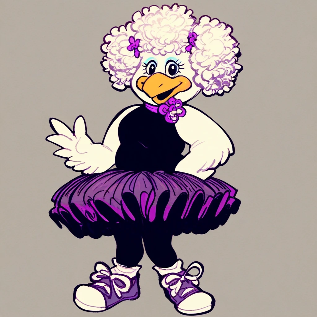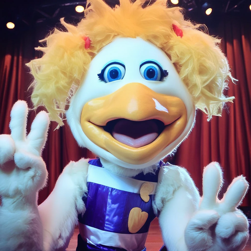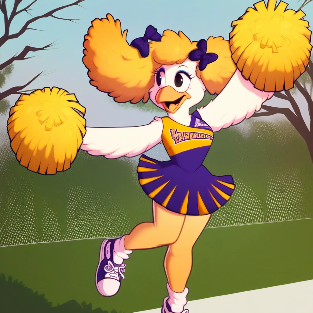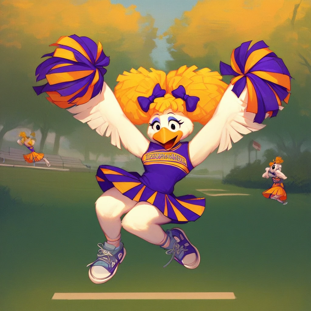 furry, bird girl, makeup, white feathers, blonde hair, cheerleader, pom pom (cheerleading), bow, sneakers, hair bow, 1990