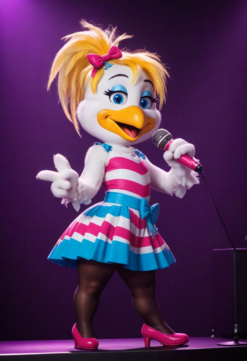 furry, bird girl, white feathers, white hair, tutu, black shirt, flower corsage choker, pantyhose, shoes, makeup, 1980