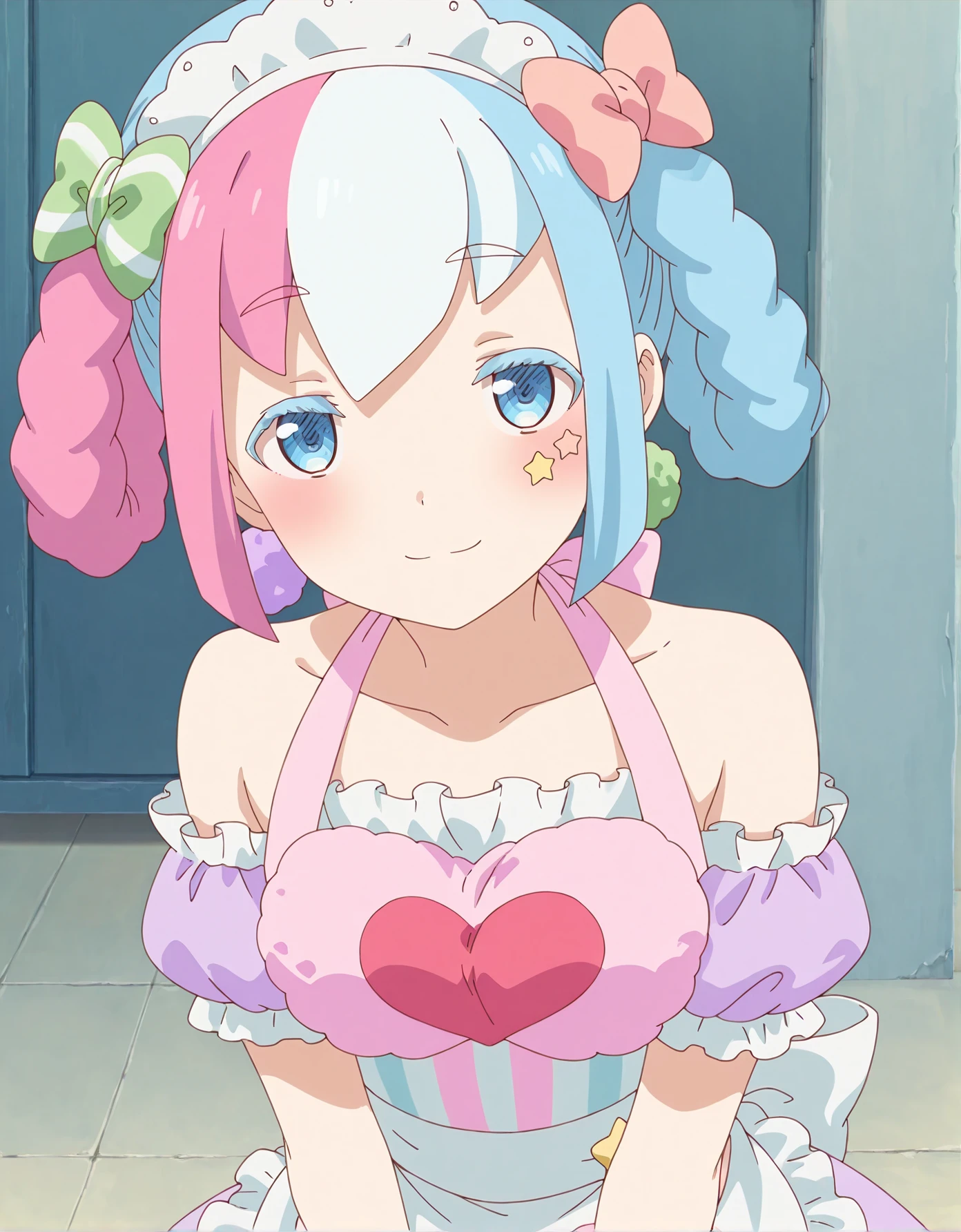 ursayumin, multicolored hair, pink hair, blue hair, hair rings, braid, hair bow, maid headdress, blue eyes, star (symbol),