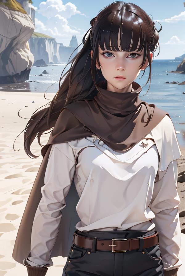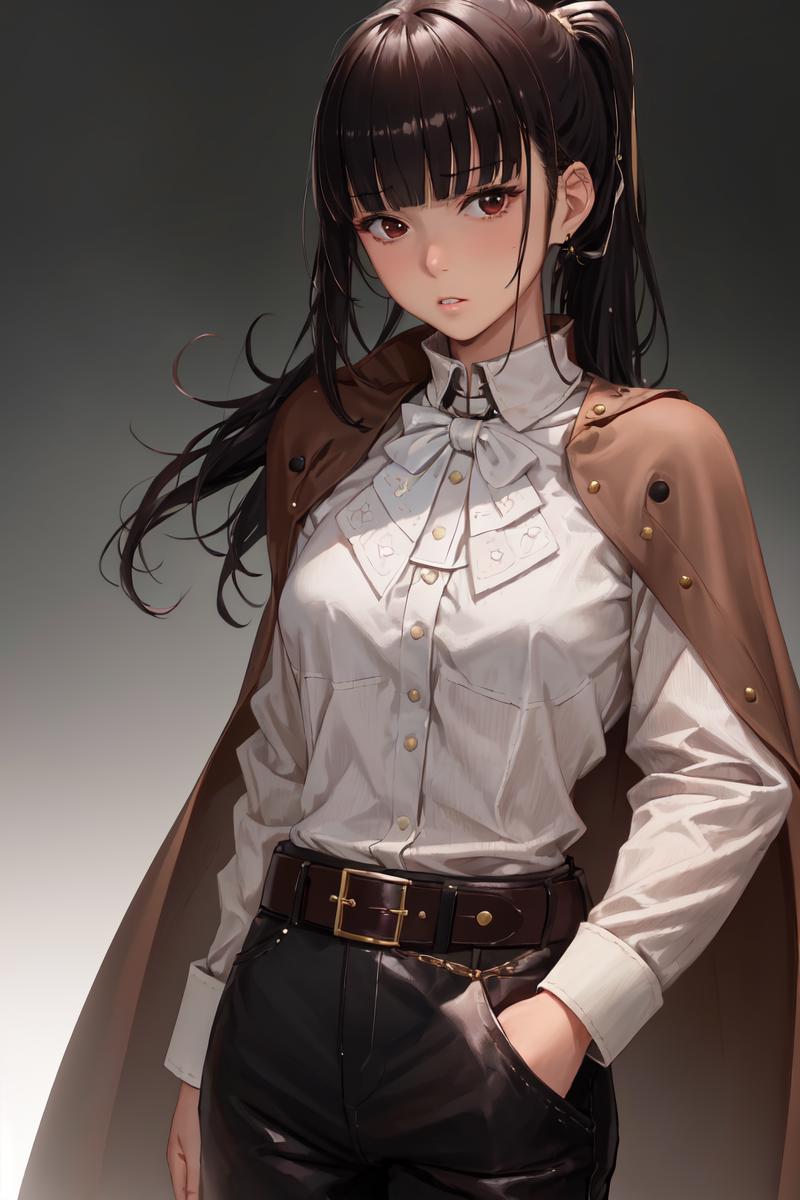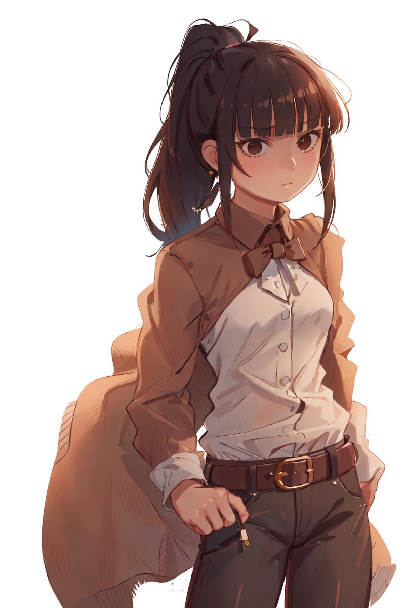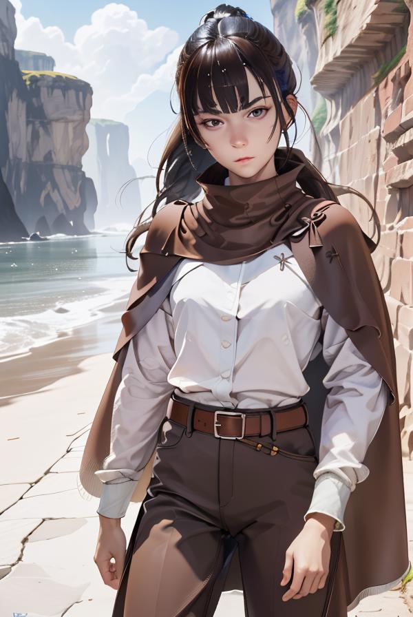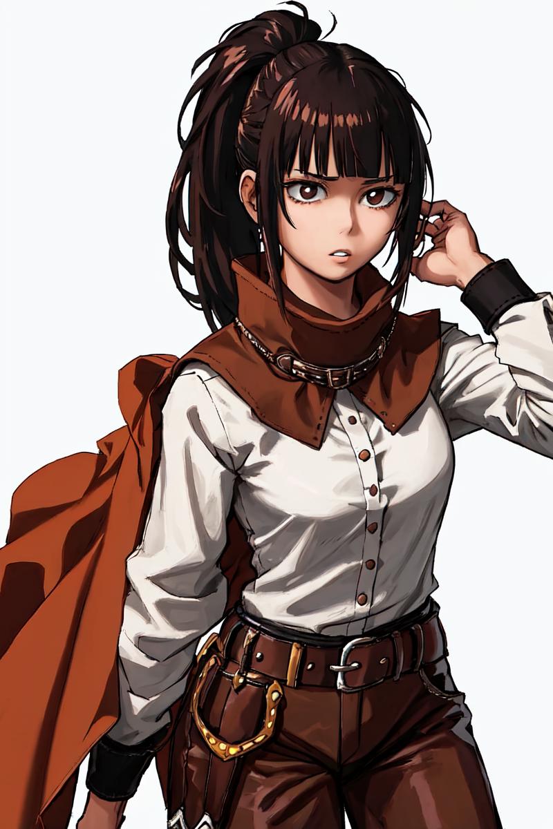 For mercenary outfit: "white shirt, long sleeves, bangs, high ponytail, (brown cape,:1.2) brown pants, head tilt, sidelocks, brown belt, belt buckle, blunt bangs"