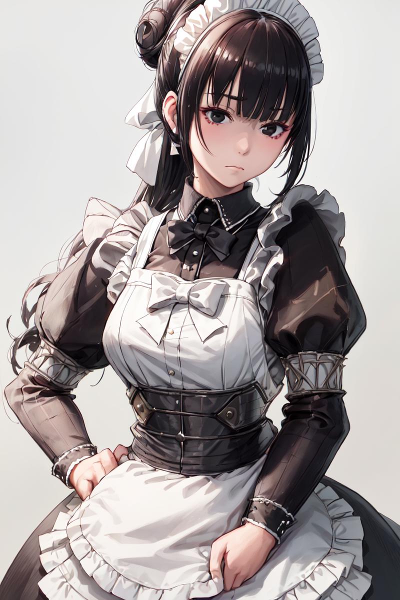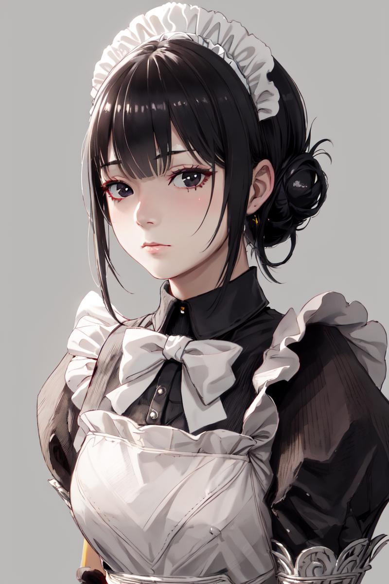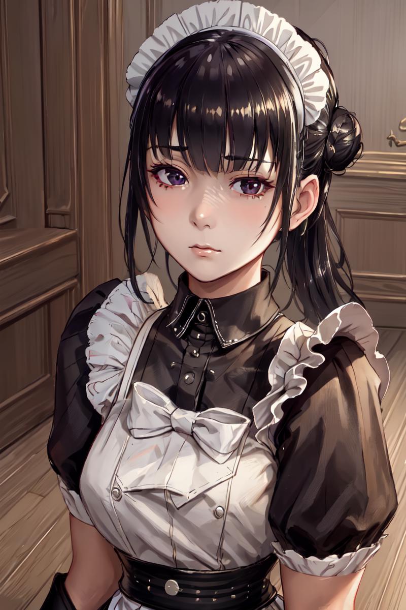 For maid outfit: "maid, black hair, apron, maid headdress, single hair bun, black eyes, maid apron"