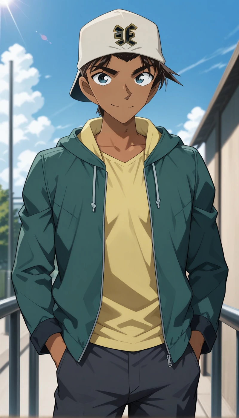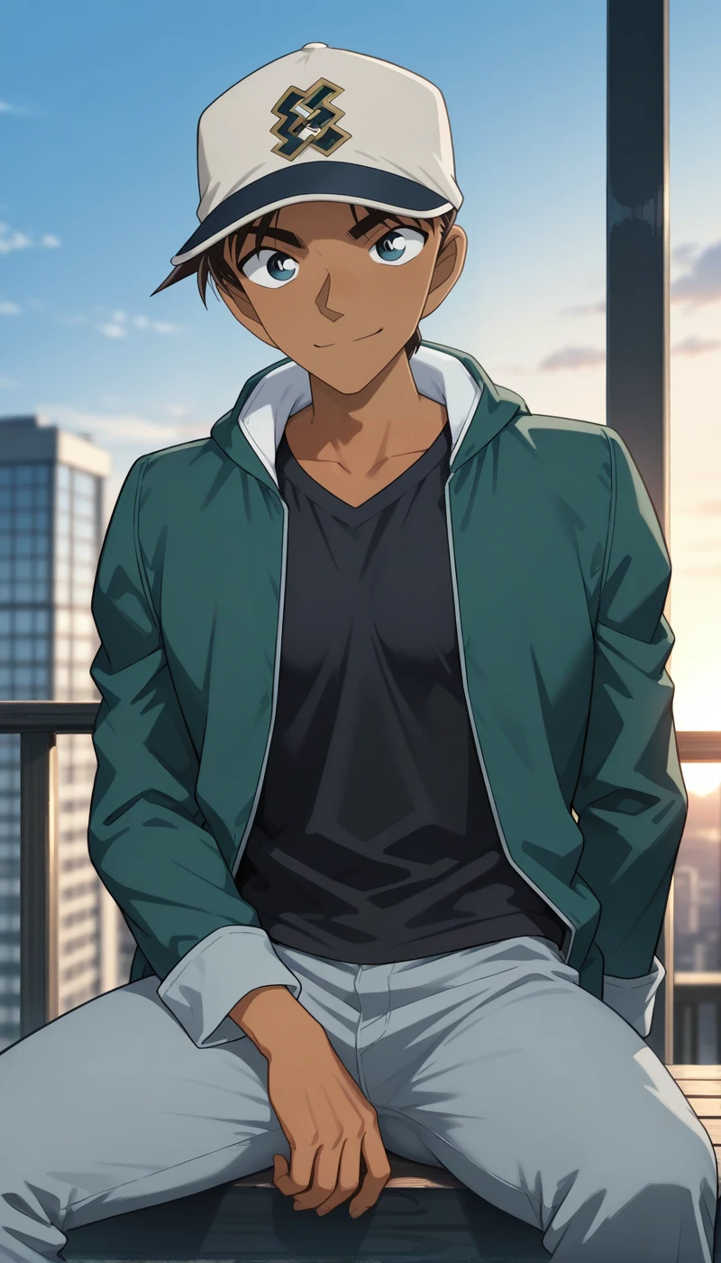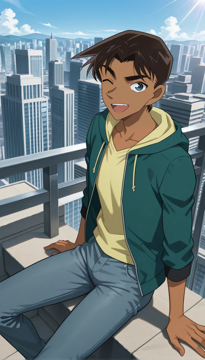 1boy,solo,male focus,heijihattori,dark skin,blue eyes,dark brown hair,short hair