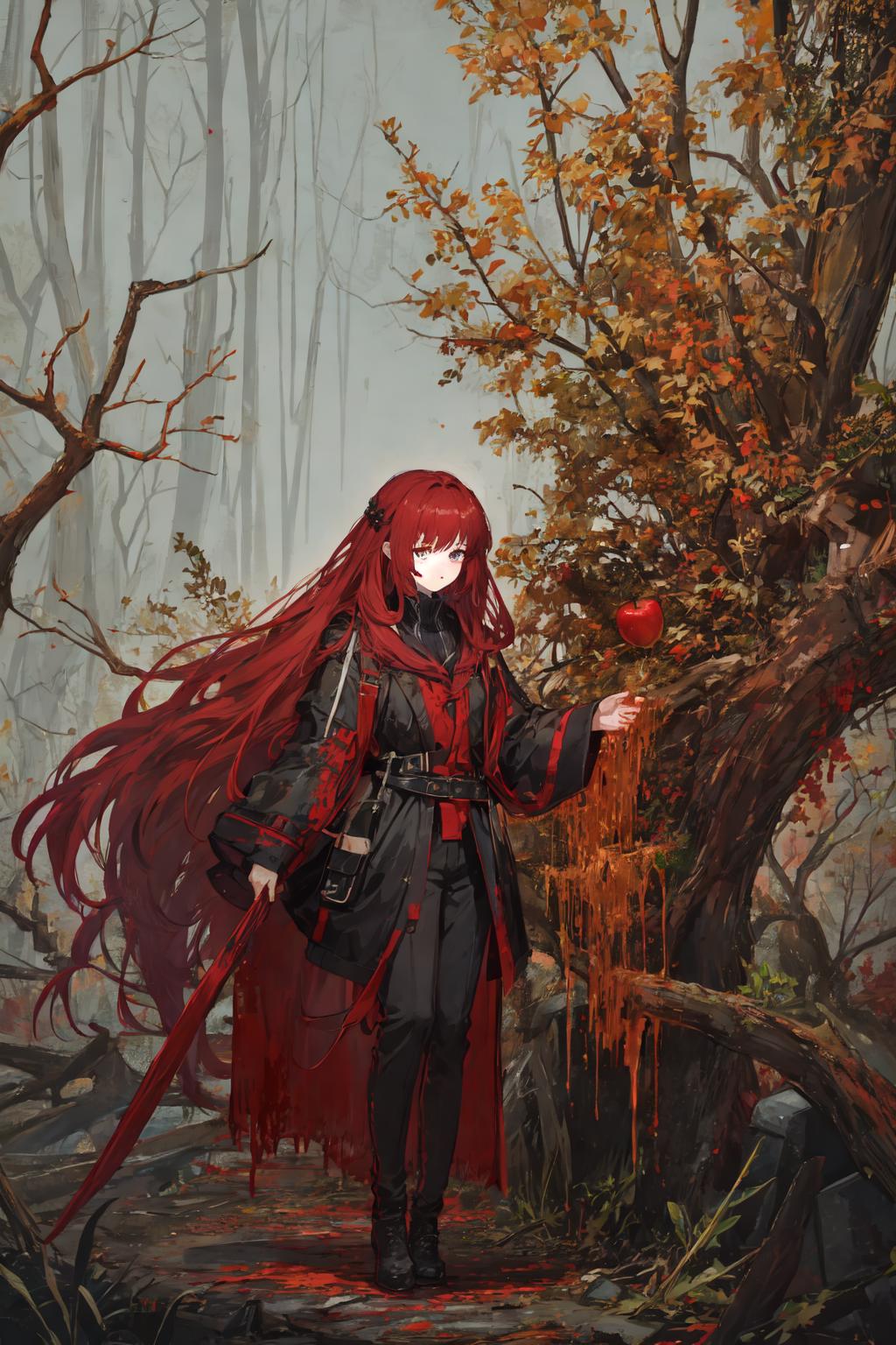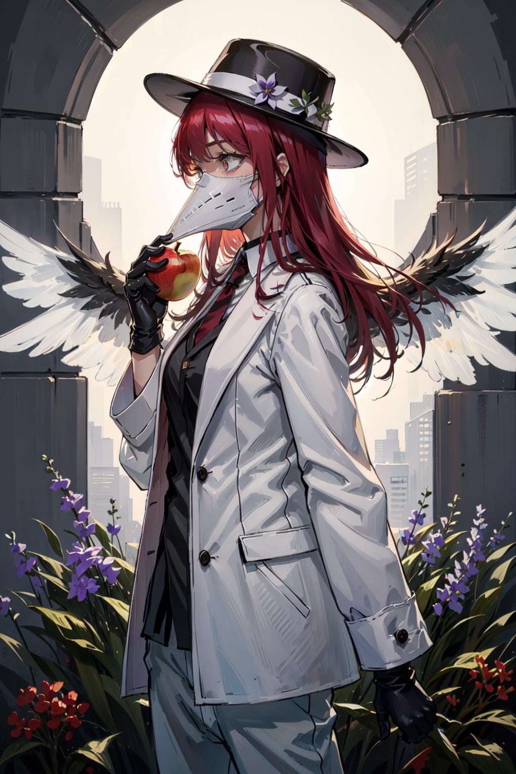 red haired person in black and white uniform standing, 1girl, solo, red hair, long hair, black footwear, boots, full body, black pants, eyepatch, outdoors, city background, day, day time,