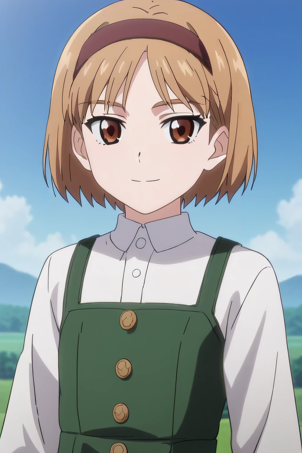 henrietta, light brown hair, brown eyes, bob cut, brown hairband, white shirt, flat chest, green dress, long sleeves