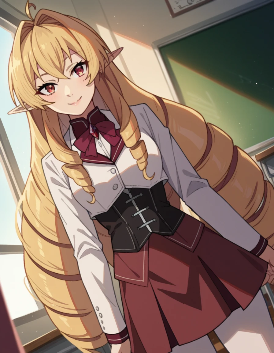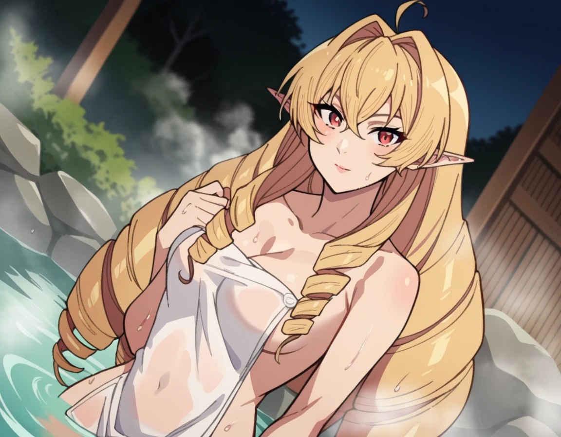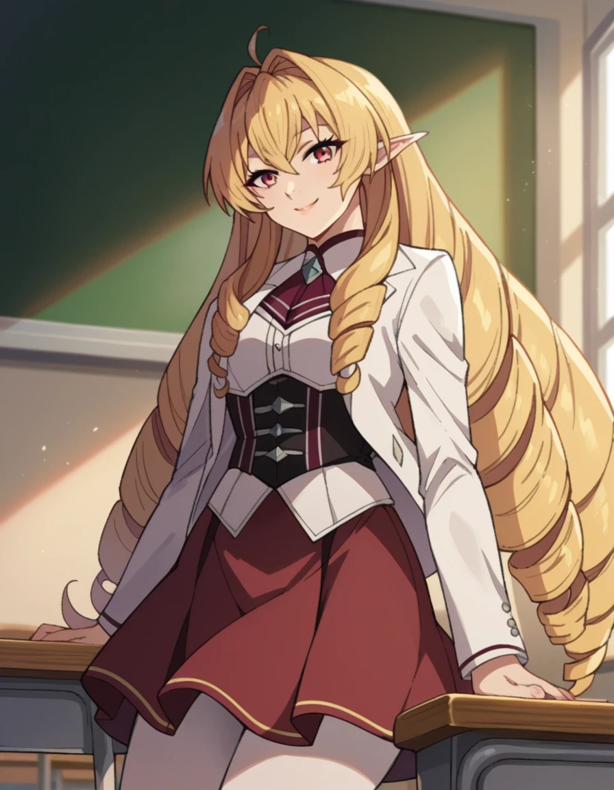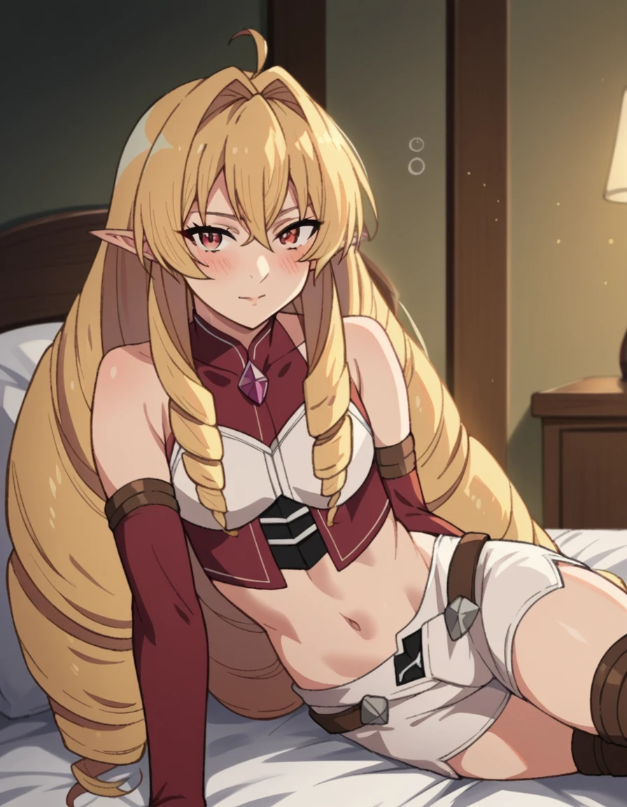 elinalise dragonroad, long hair, blonde hair, very long hair, ahoge, pointy ears, drill hair, red eyes,