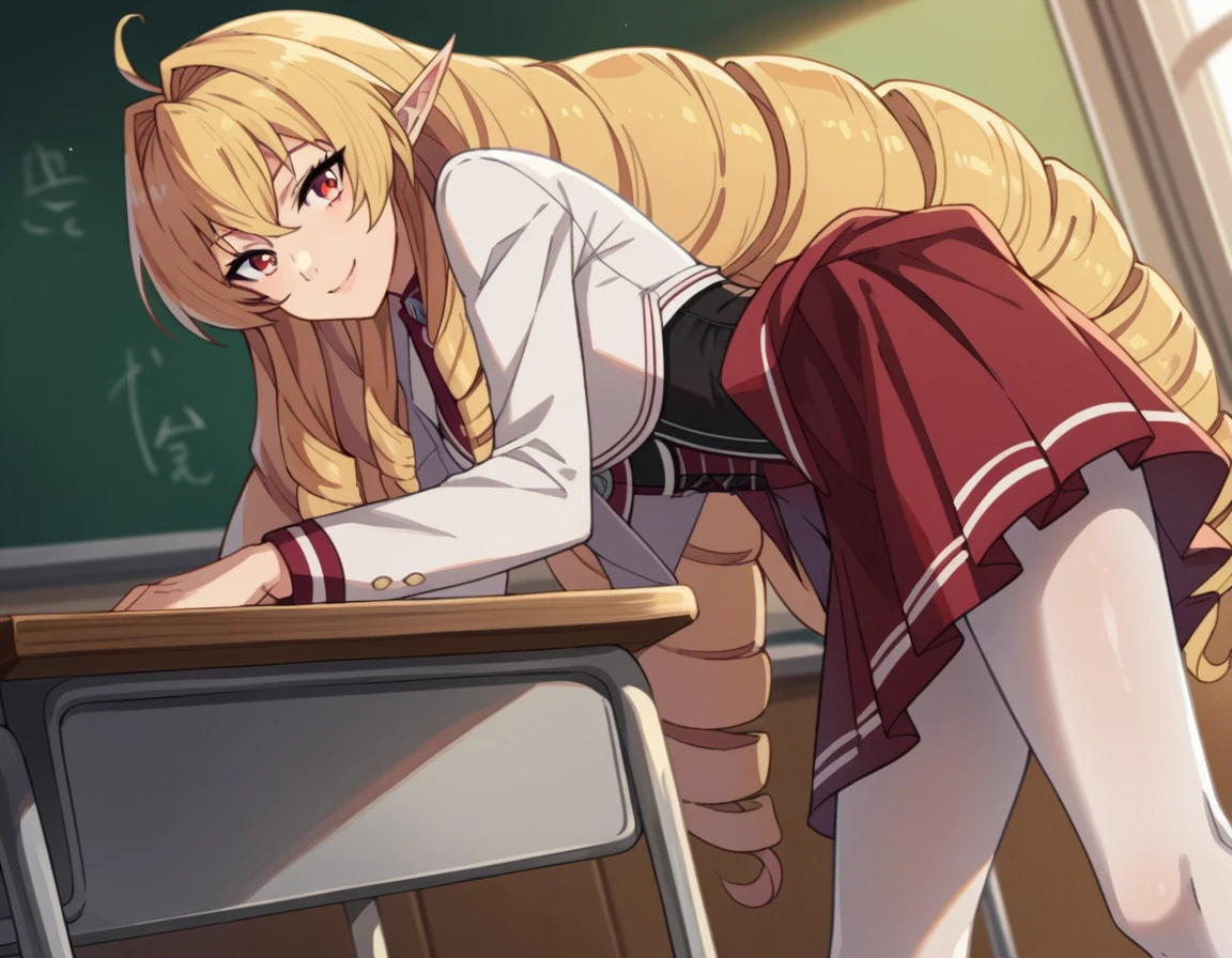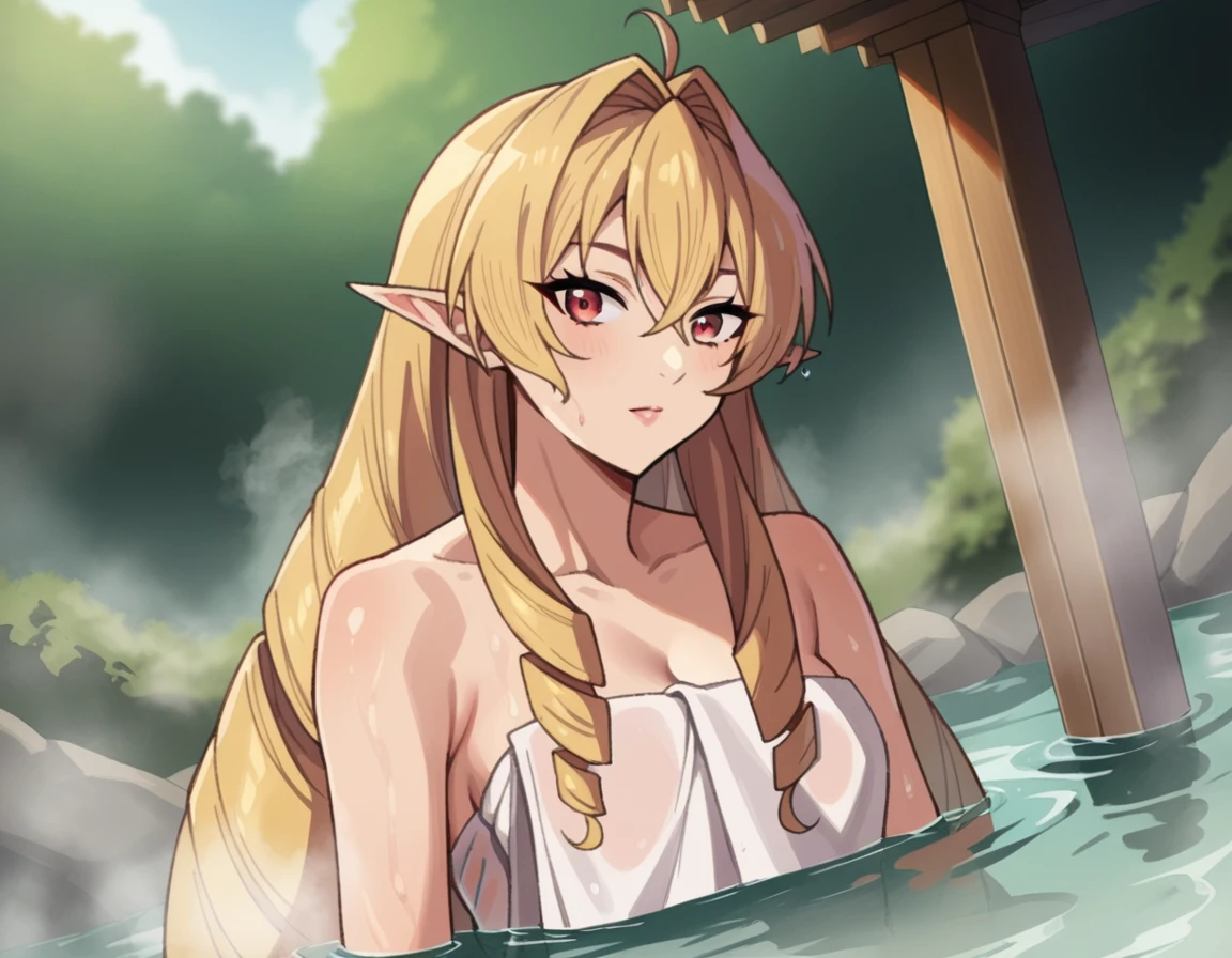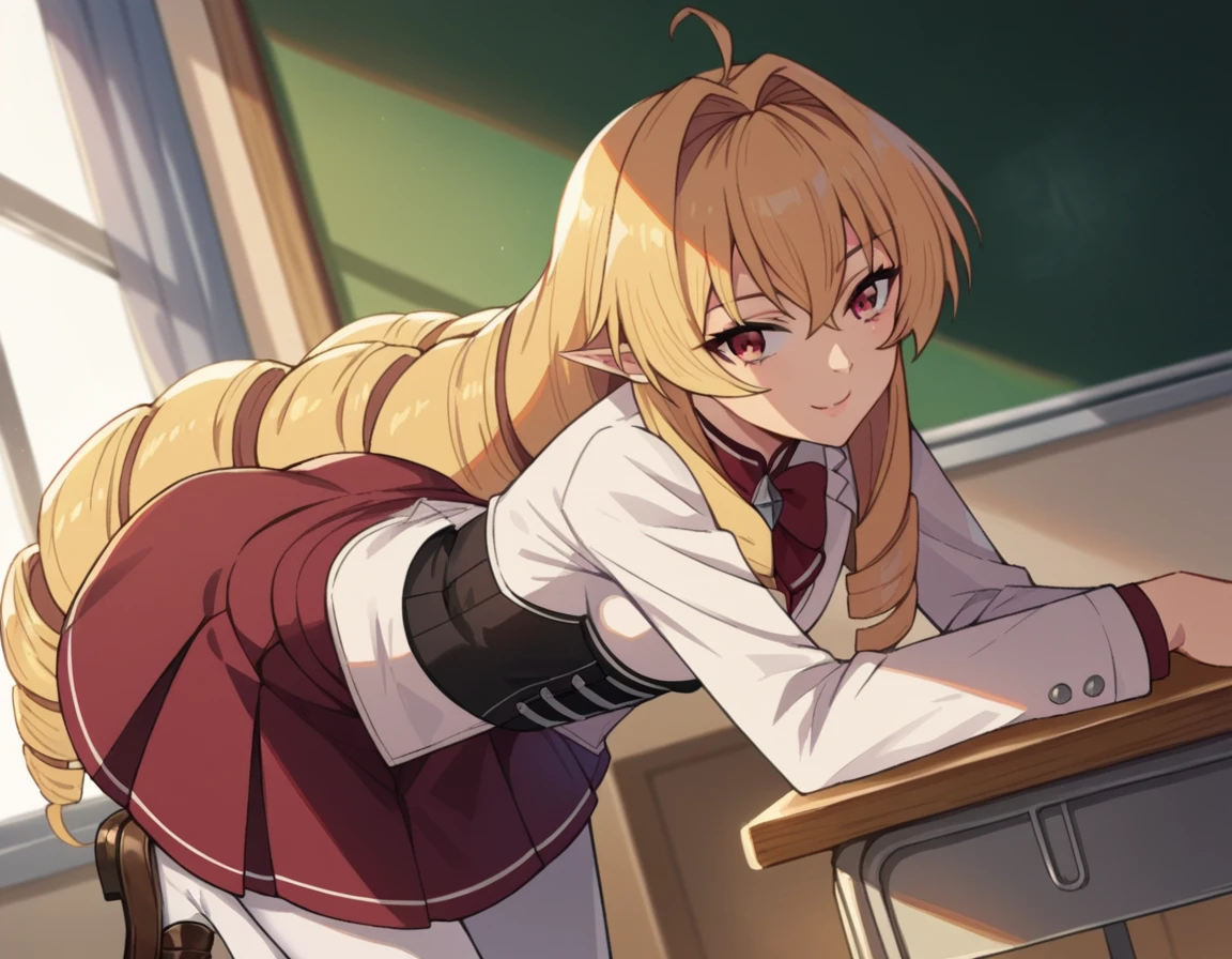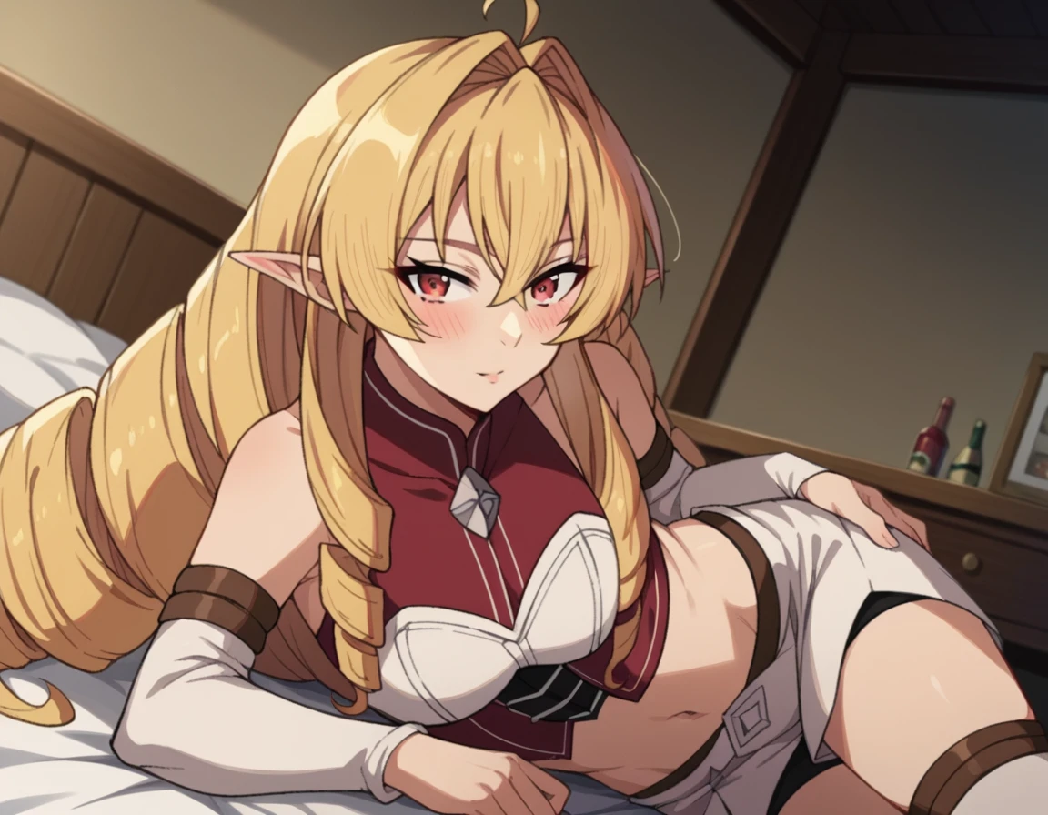 elinalise dragonroad, long hair, blonde hair, very long hair, ahoge, pointy ears, drill hair, red eyes,
