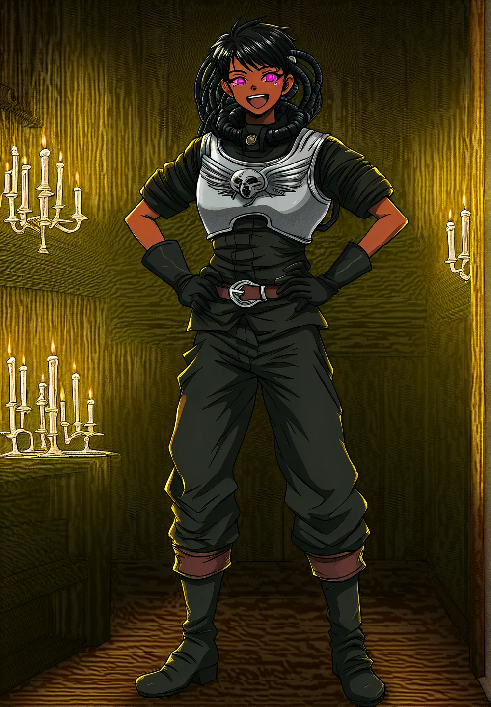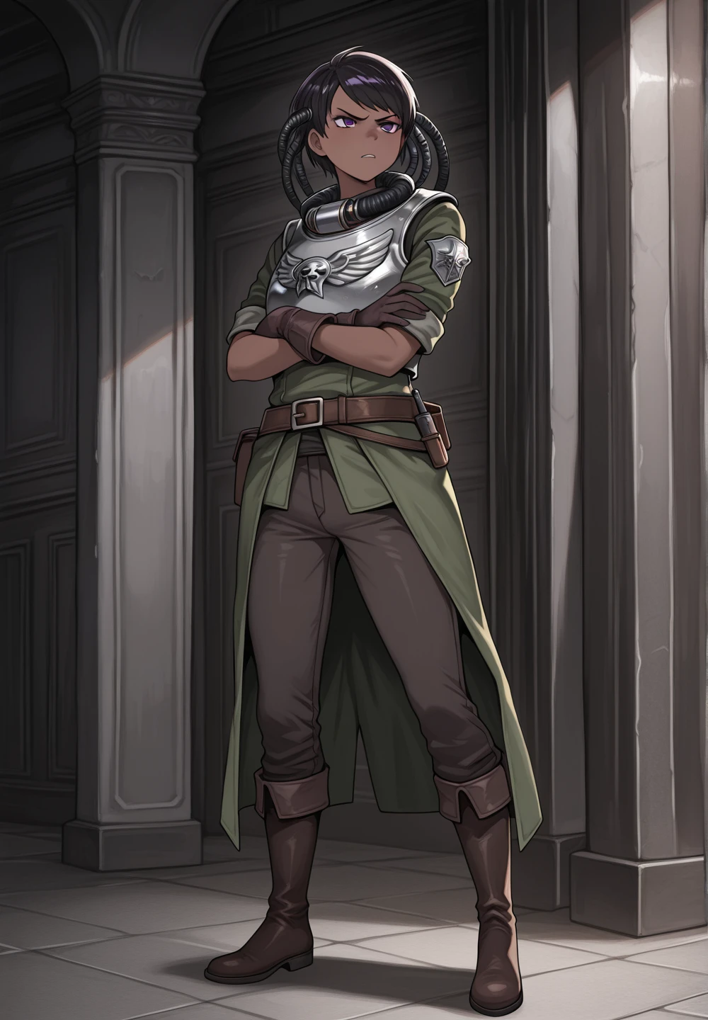 For her ingame appearance, "short hair,black/brown hair,cable, dark-skinned female, purple eyes,armor,breastplate,pants,boots,"