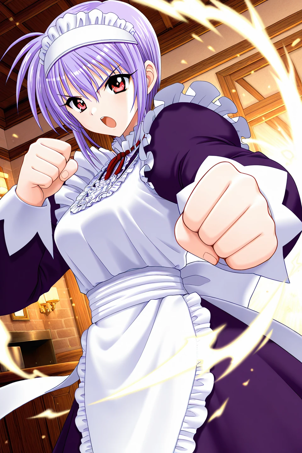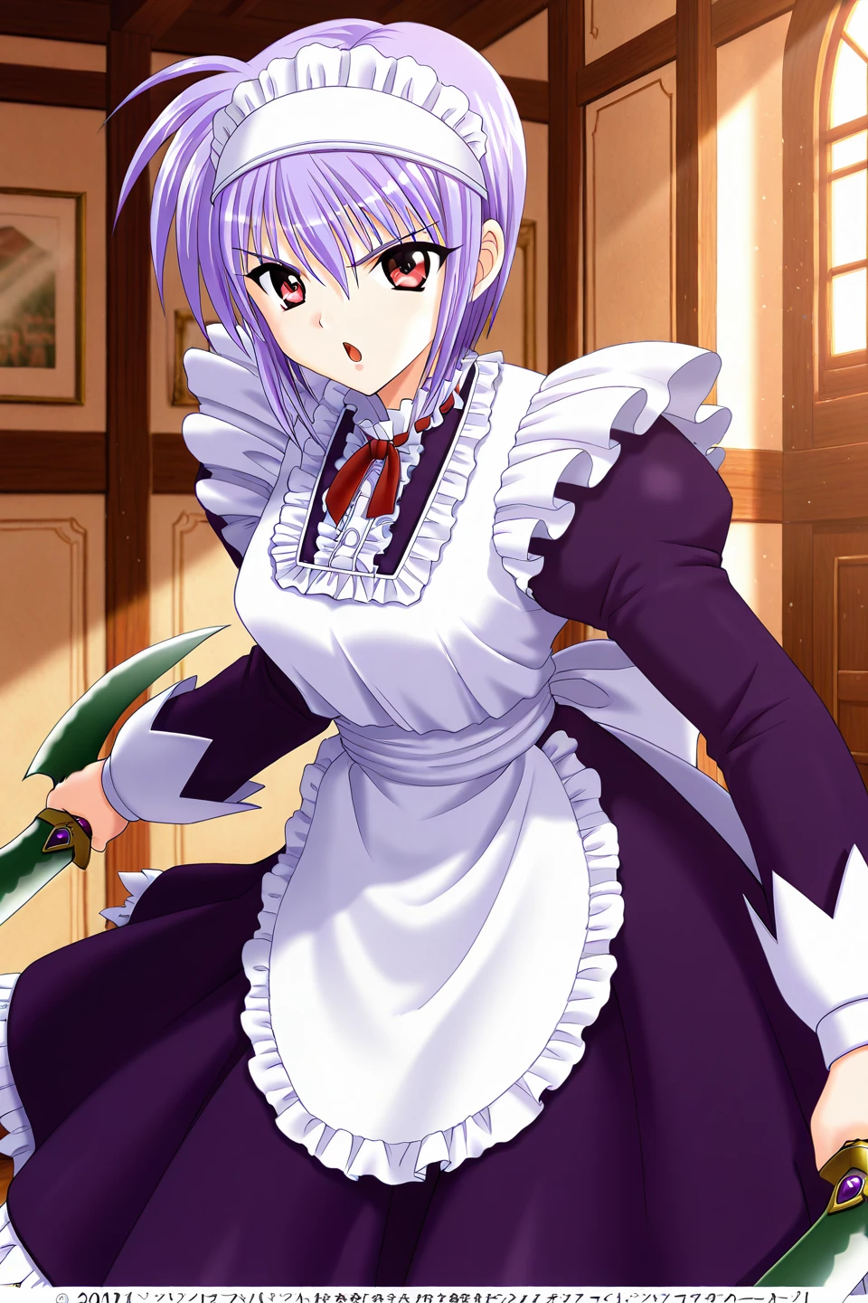 maid headdress,purple dress,frilled collar,center frills,neck ribbon,ribbon-trimmed collar,red ribbon,juliet sleeves,wrist cuffs,maid apron,white apron,frilled apron,white bow,back bow,