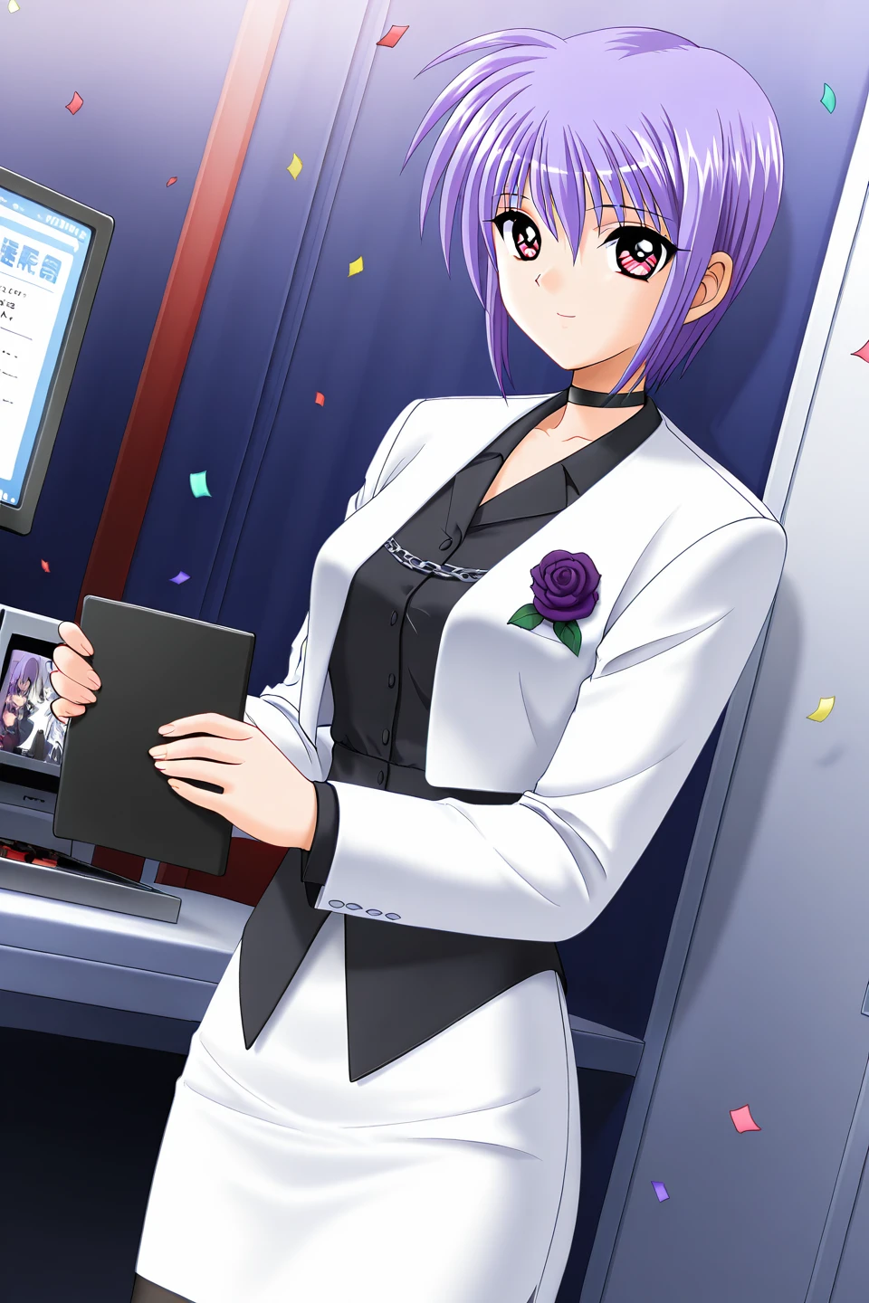 no headwear,formal,suit,white jacket,cropped jacket,open jacket,collarbone,breast rose,purple rose,long sleeves,black choker,collared shirt,untucked shirt,buttons,black tailcoat,black vest,chain,white skirt,miniskirt,narrow skirt,tight skirt,
