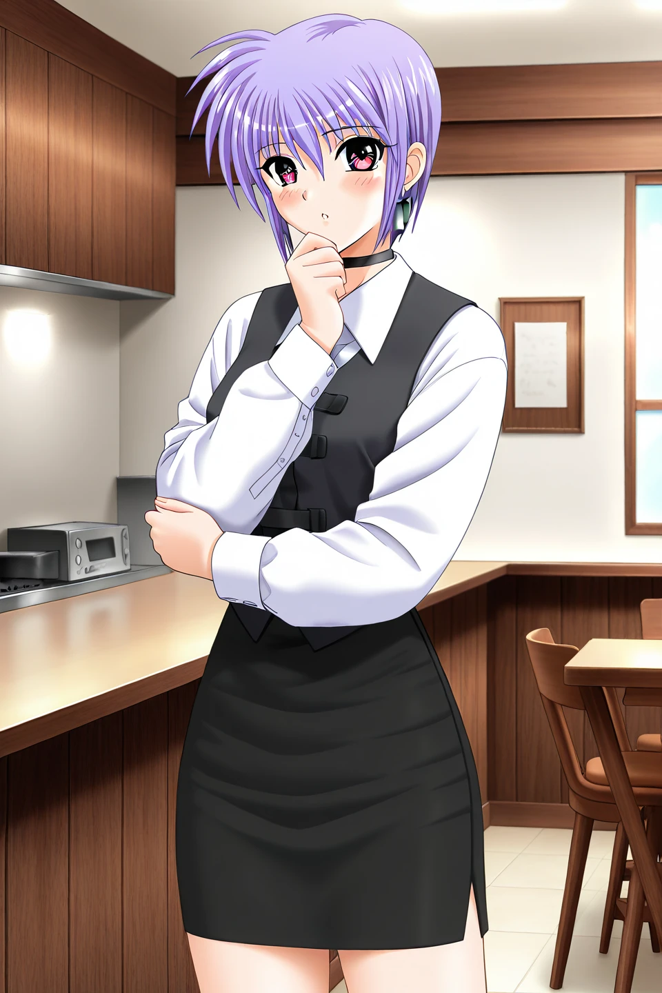 no headwear,cross earrings,latin cross,black choker,pearl necklace,white shirt,dress shirt,collared shirt,long sleeves,black vest,multi-belt vest,black skirt,pencil skirt,b