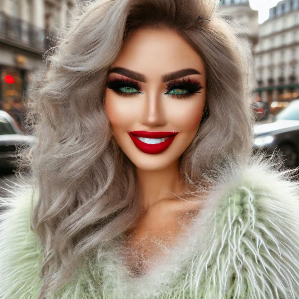 <lora:LaDy_IceQ XL:2.0> LaDy_IceQ XL (best quality:1.2), 4k, 8k, ultra highres, raw photo in hdr, sharp focus, intricate texture, detailed facial features, highly detailed face, posing, perfect lighting, Woman with long, wavy silver blonde hair and a heavy makeup look, including (long fake lashes), (winged eyeliner), and filled in brows, wearing an (extremely fluffy:1.6) cropped sweater, (extremely fluffy:1.6) knitted pants, high-heeled fur trimmed boots, smiling and looking at the camera, showing well-arranged white teeth, vibrant red lipstick on lips, (green eyes).