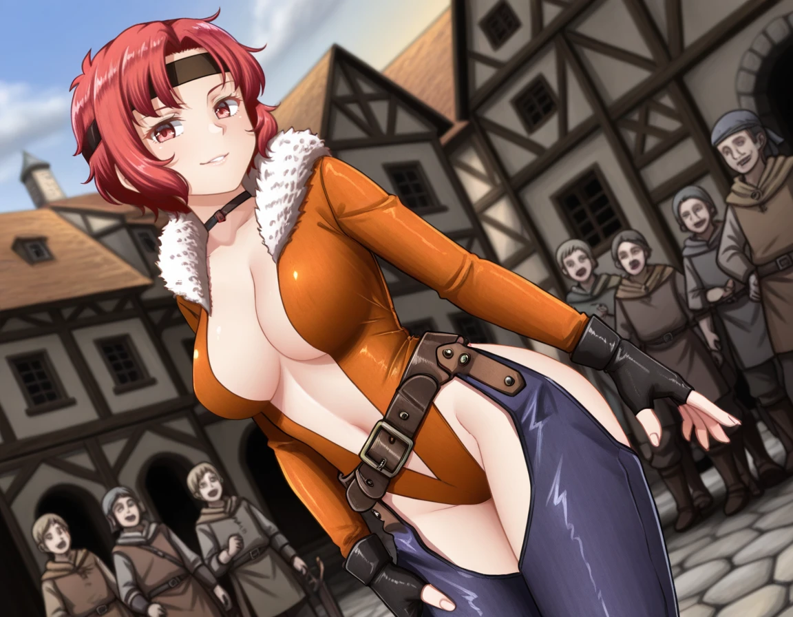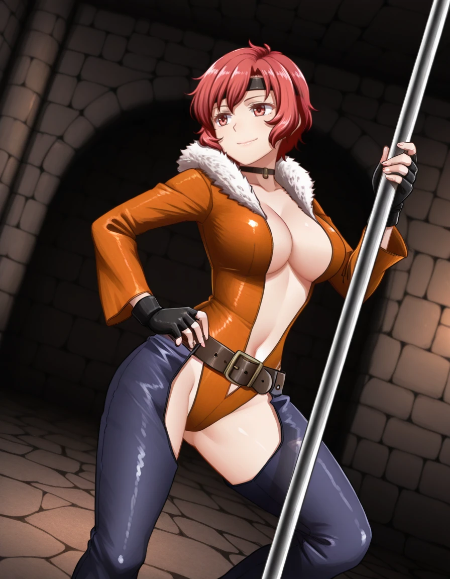 1girl, KuroinuMaia, short hair, red hair, choker, headband, red eyes, breasts, fur trim, center opening, red leotard, sleeves, cleavage, fingerless gloves, belt, blue chaps