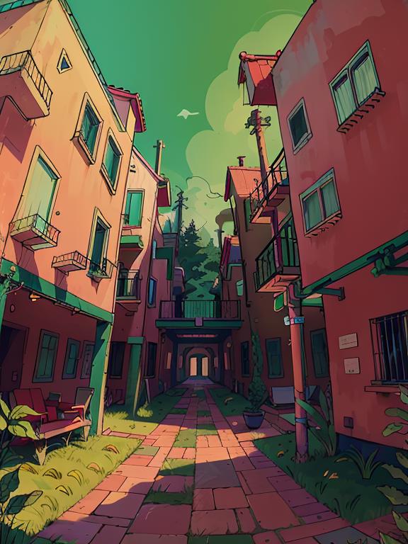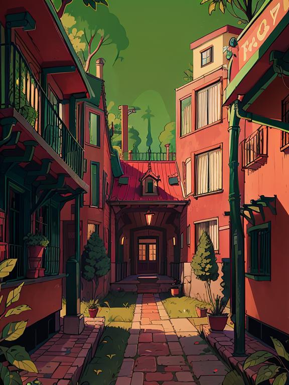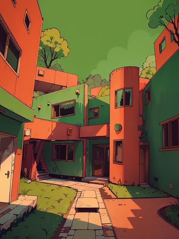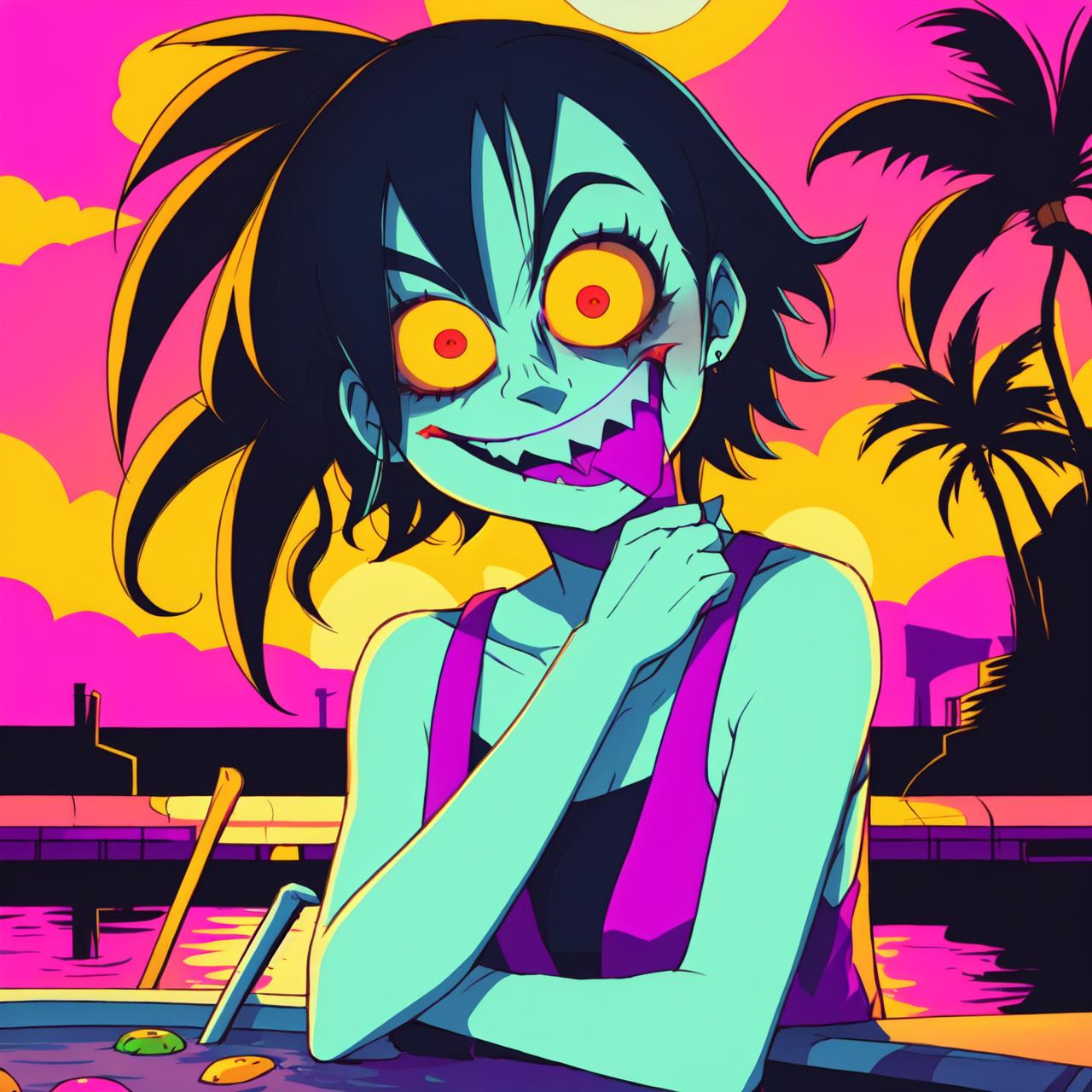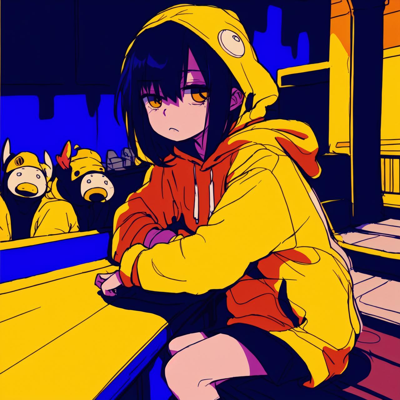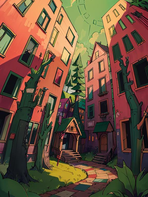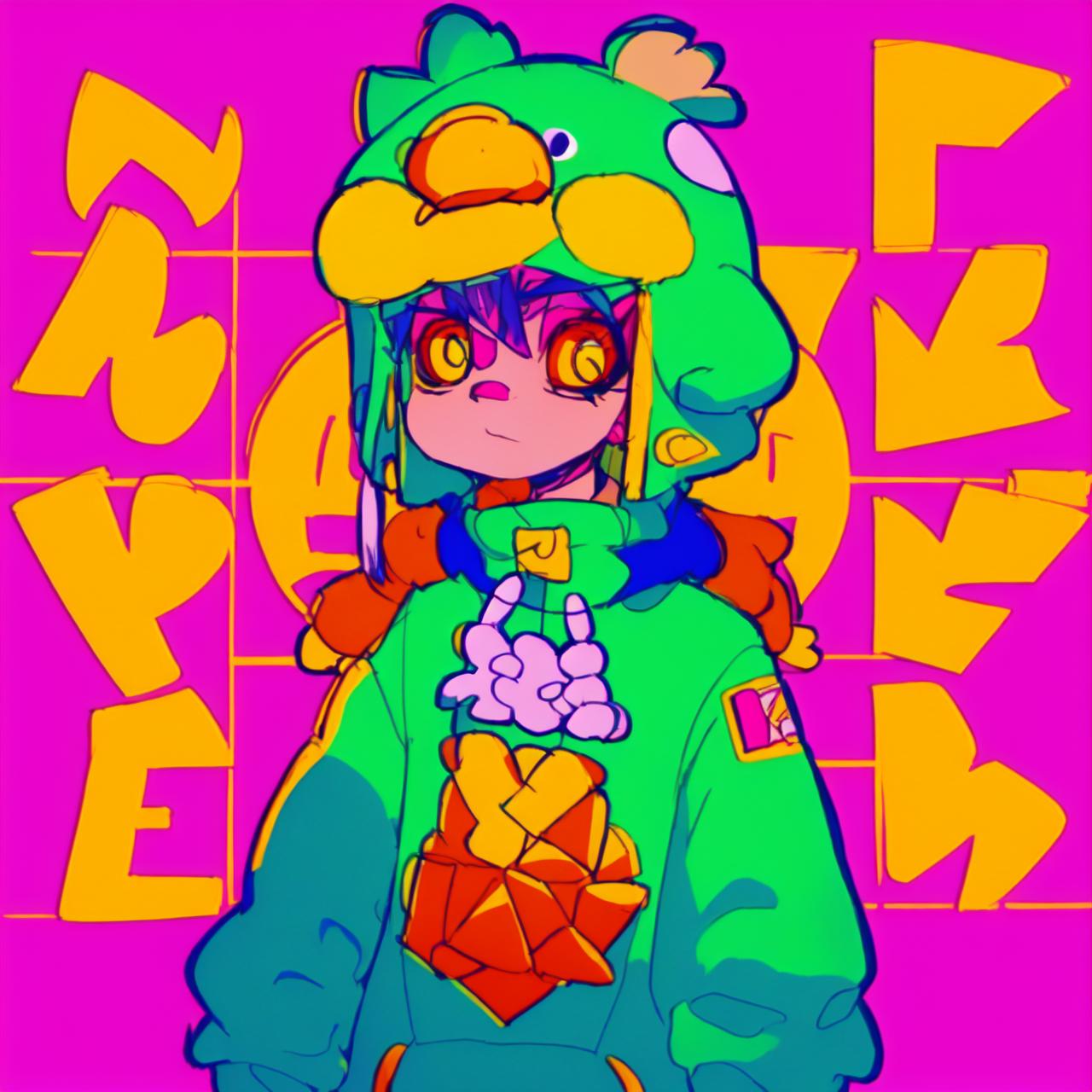 Trained on a mix of images, most of which might be considered 'eye strain art' but which trend toward a more simplistic cartoon-like aesthetic. It's intended to produce interesting color combinations and aesthetics, and possibly destroy your eyes.
