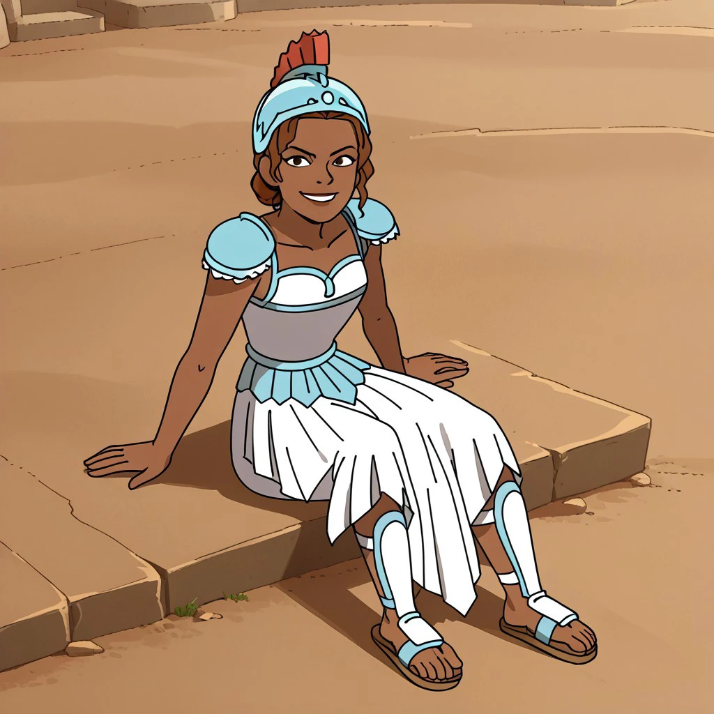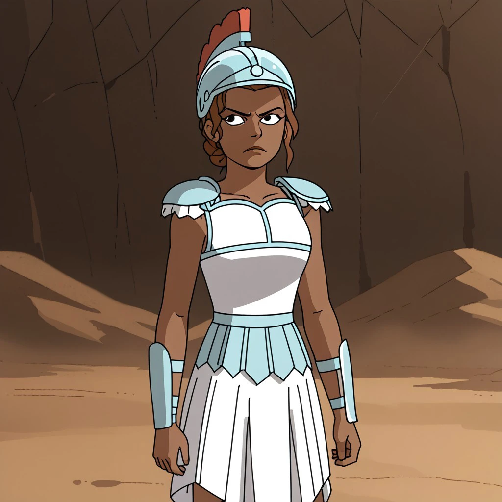1girl,solo,dark skin,armor,brown hair,single hair bun,helmet,dress,sandals